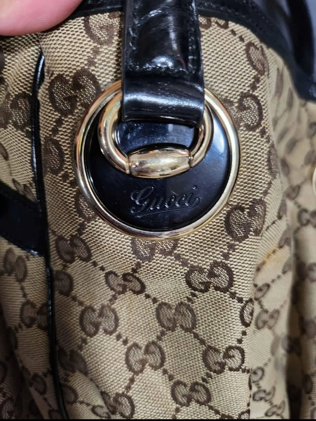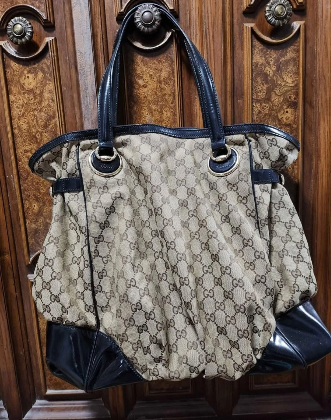 A spacious tote bag featuring a repeating pattern. Black leather trim accents. Double handle design. A perfect bag for a stress-free day.