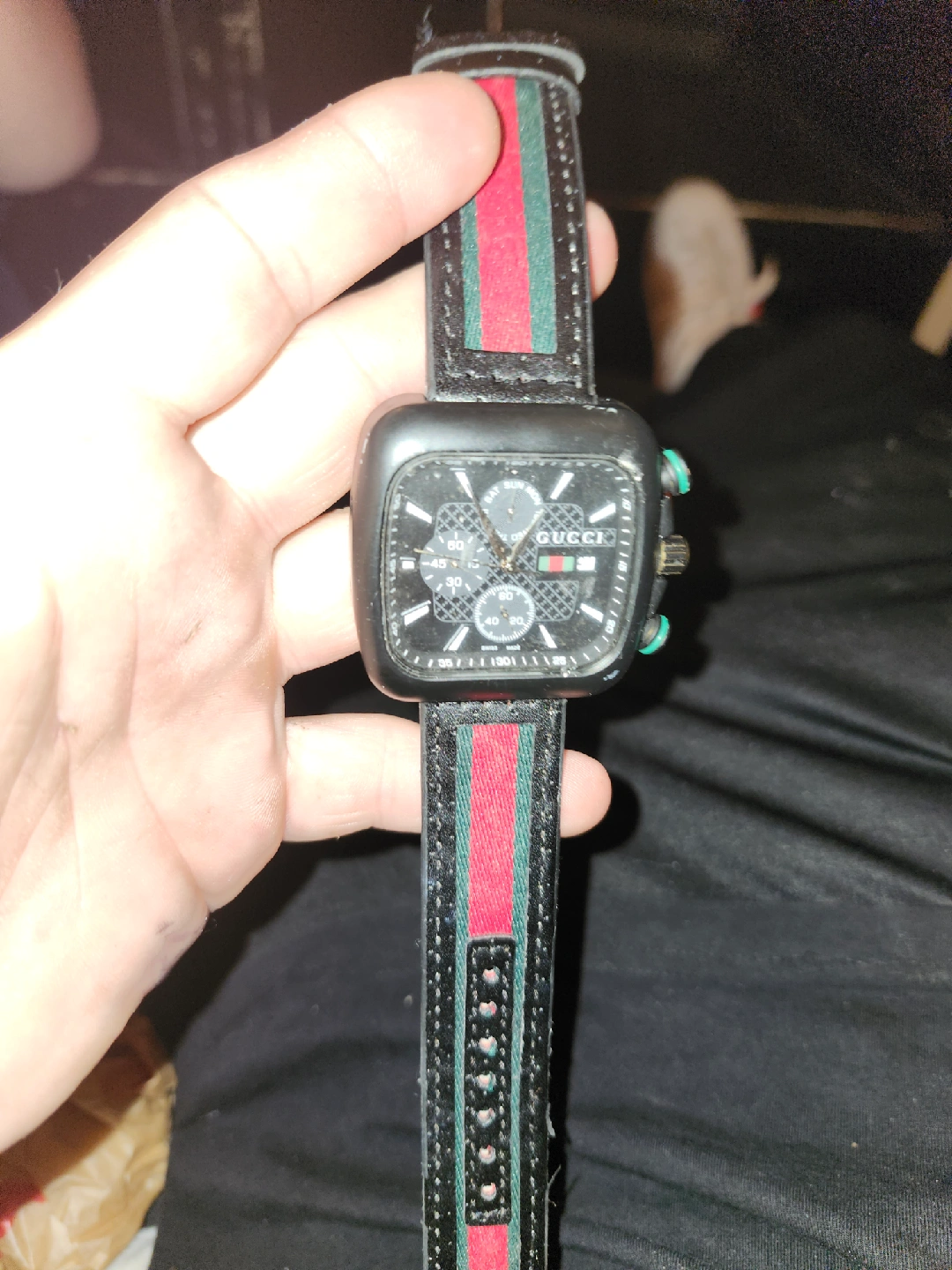 Selling a used Gucci watch. It has a black face and a distinctive red and green striped band. It shows signs of wear, but is still a stylish accessory!