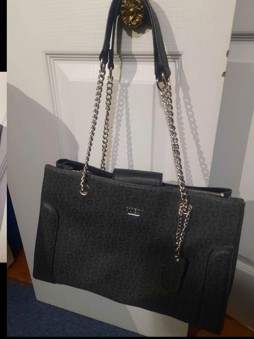 Large black tote bag. Features a silver chain strap and Guess logo print. Zipper closure. Excellent for everyday use. very good condition