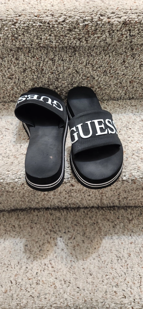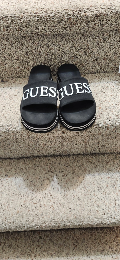 Step out in style with these Guess black platform slides, perfect for adding a touch of casual chic to your everyday look. These slides feature a bold 'GUESS' logo across the strap, combining comfort with iconic branding. These are in used condition. Size 8 * Brand: Guess * Colour: Black * Style: Slide * Platform Height: Approximately 1 inch Pick up in Orleans.