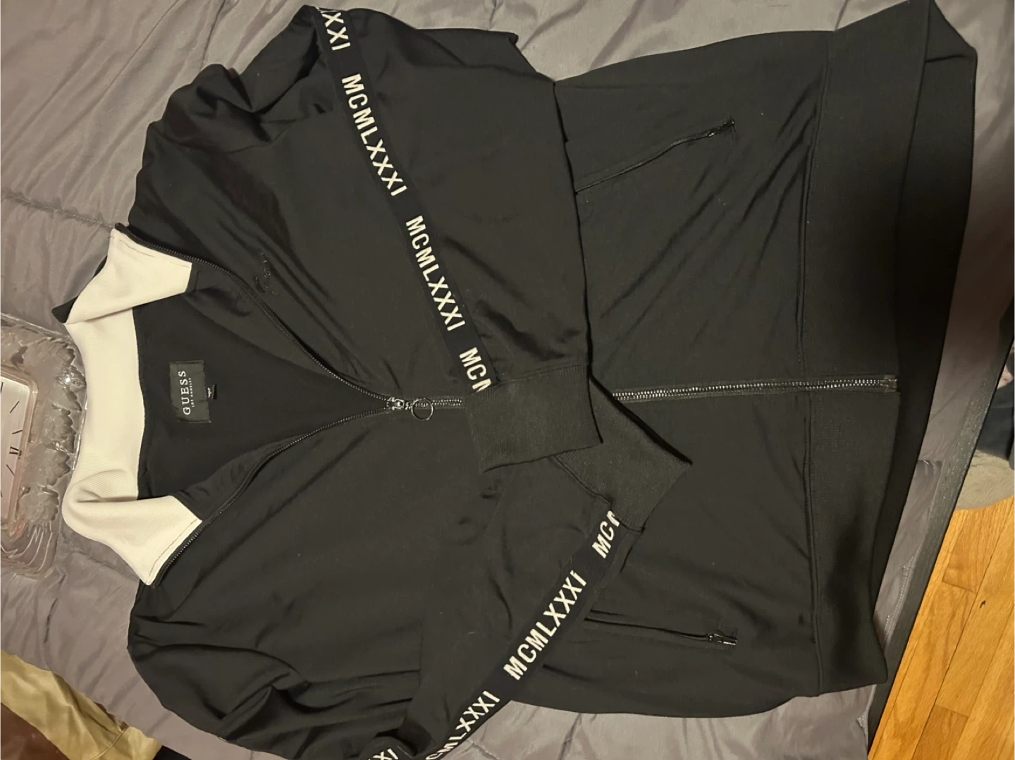 Selling a black Guess track jacket. It has a zipper and the number MCMLXXXI on the sleeves. Great for workouts or casual wear!