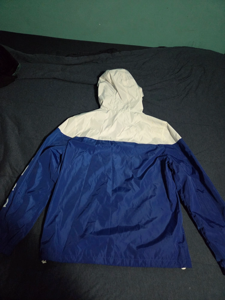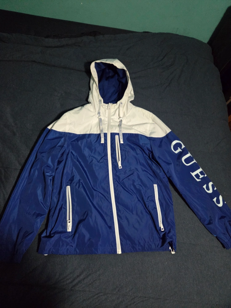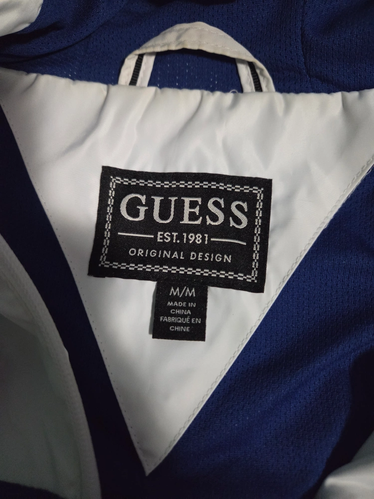 Selling a Guess windbreaker jacket in a stylish blue and white colour scheme. It's a size medium and features the Guess logo prominently on the sleeve. Great for those breezy days!
