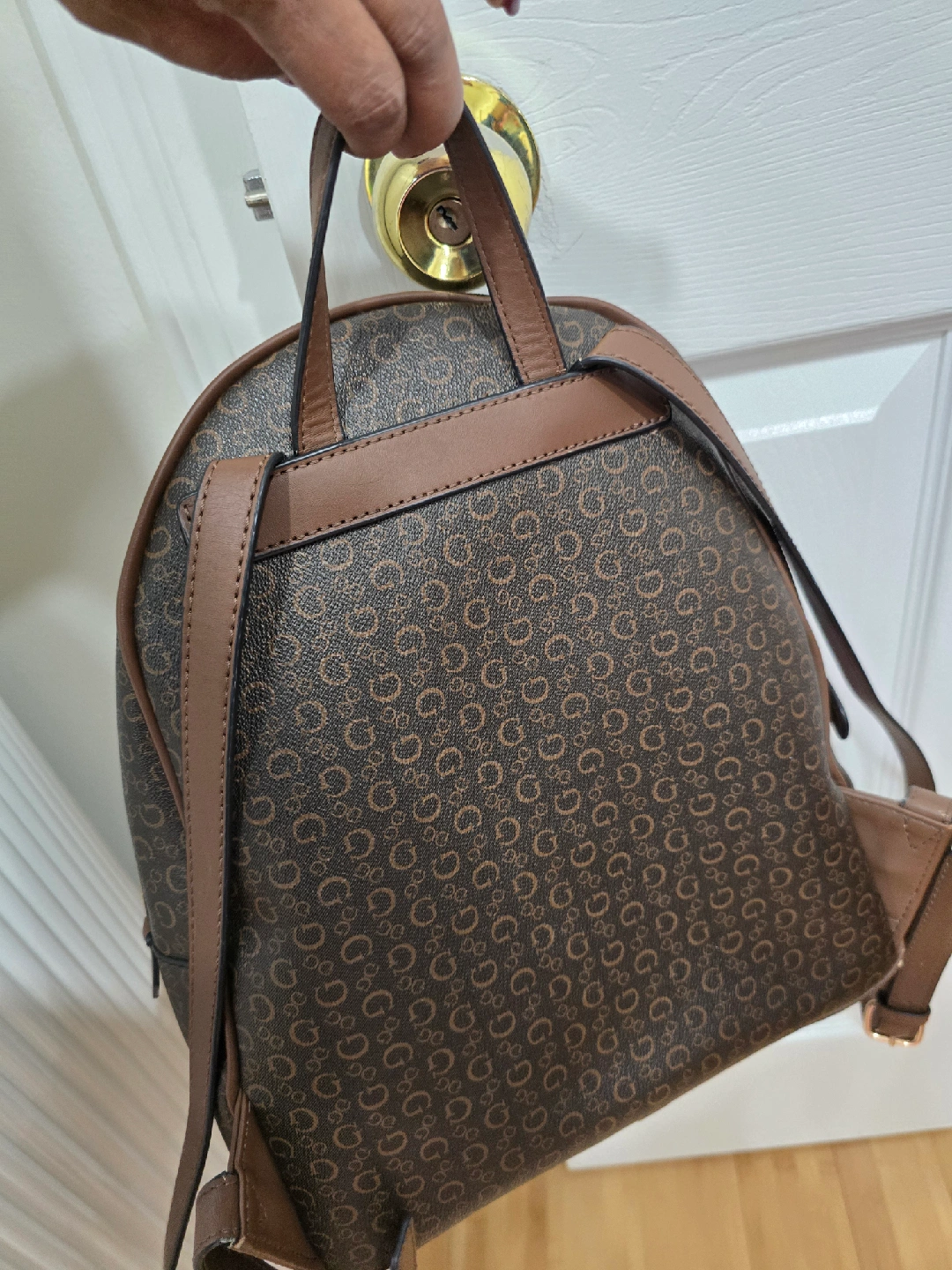 Selling a Guess backpack with a brown patterned design. It's in great condition and perfect for everyday use. The backpack features a front pocket with a zipper and adjustable straps. It's a stylish and functional accessory!