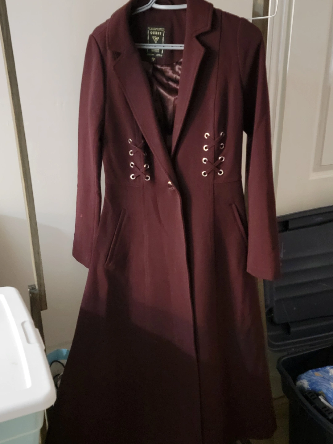 Selling a Guess coat in a lovely burgundy colour. It's a size S and features a unique lace-up detail on the front. Perfect for adding a touch of sophistication to your wardrobe! wore it twice