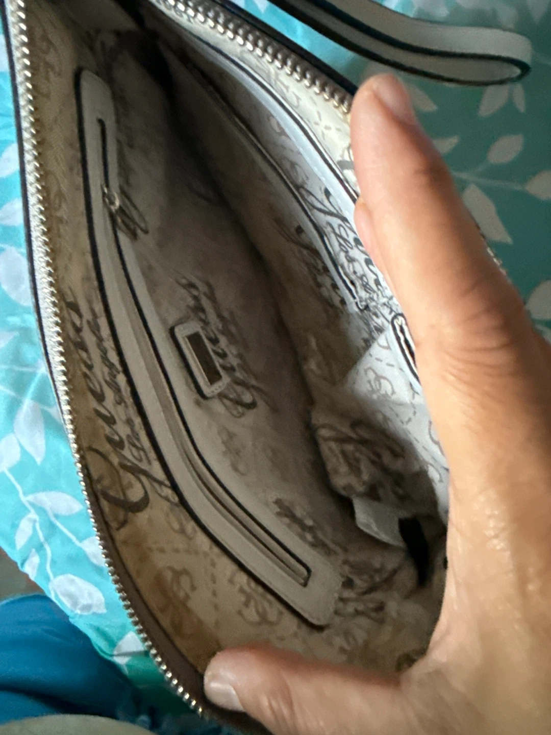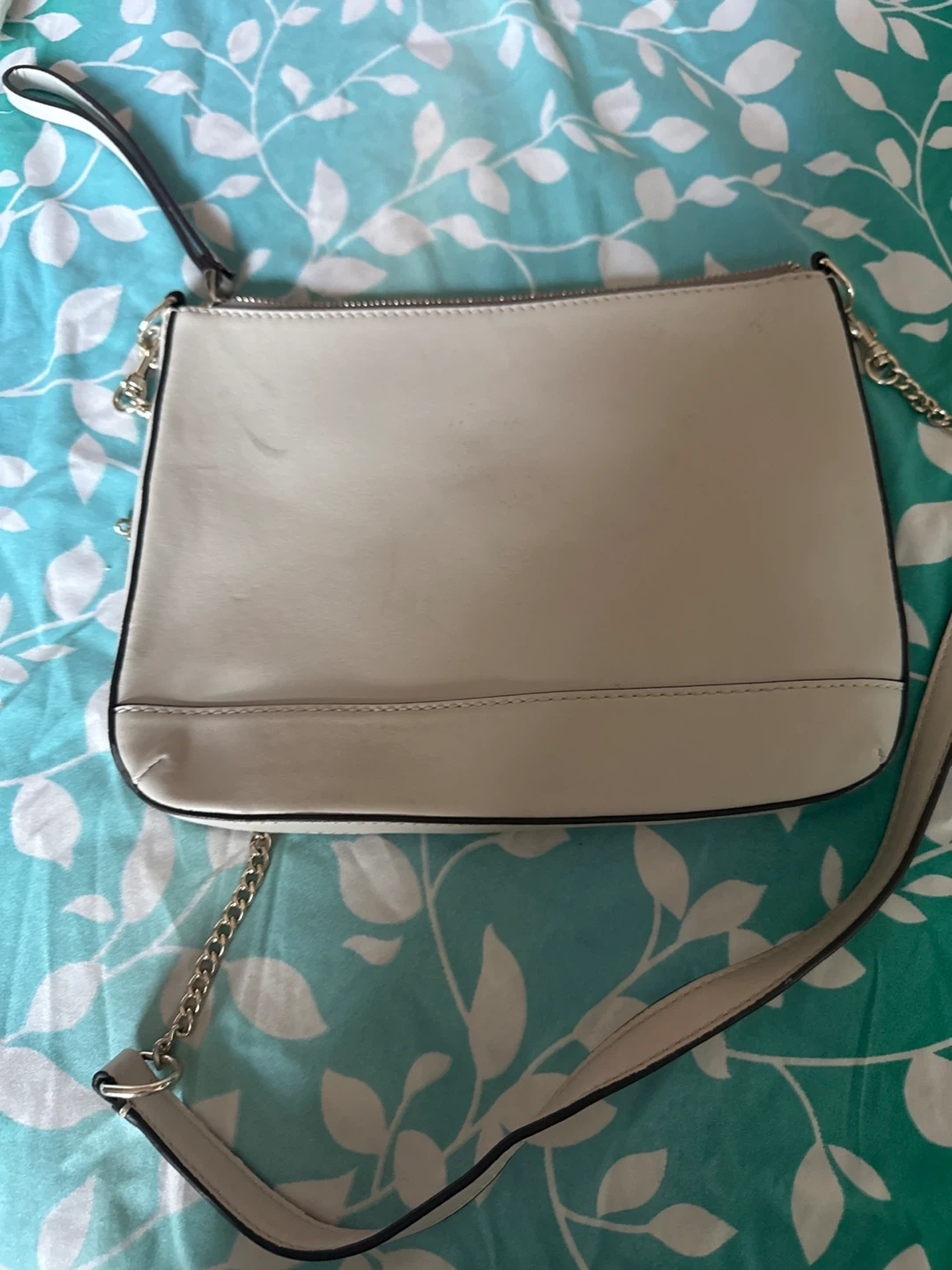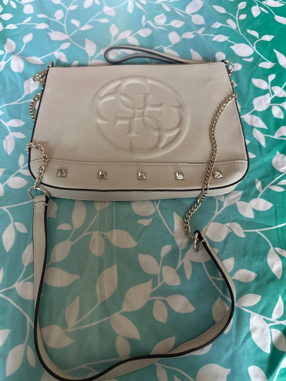 Selling a cream-coloured Guess crossbody bag. It features a chain strap and a zip closure. The bag has a stylish design with the Guess logo embossed on the front. Perfect for everyday use!