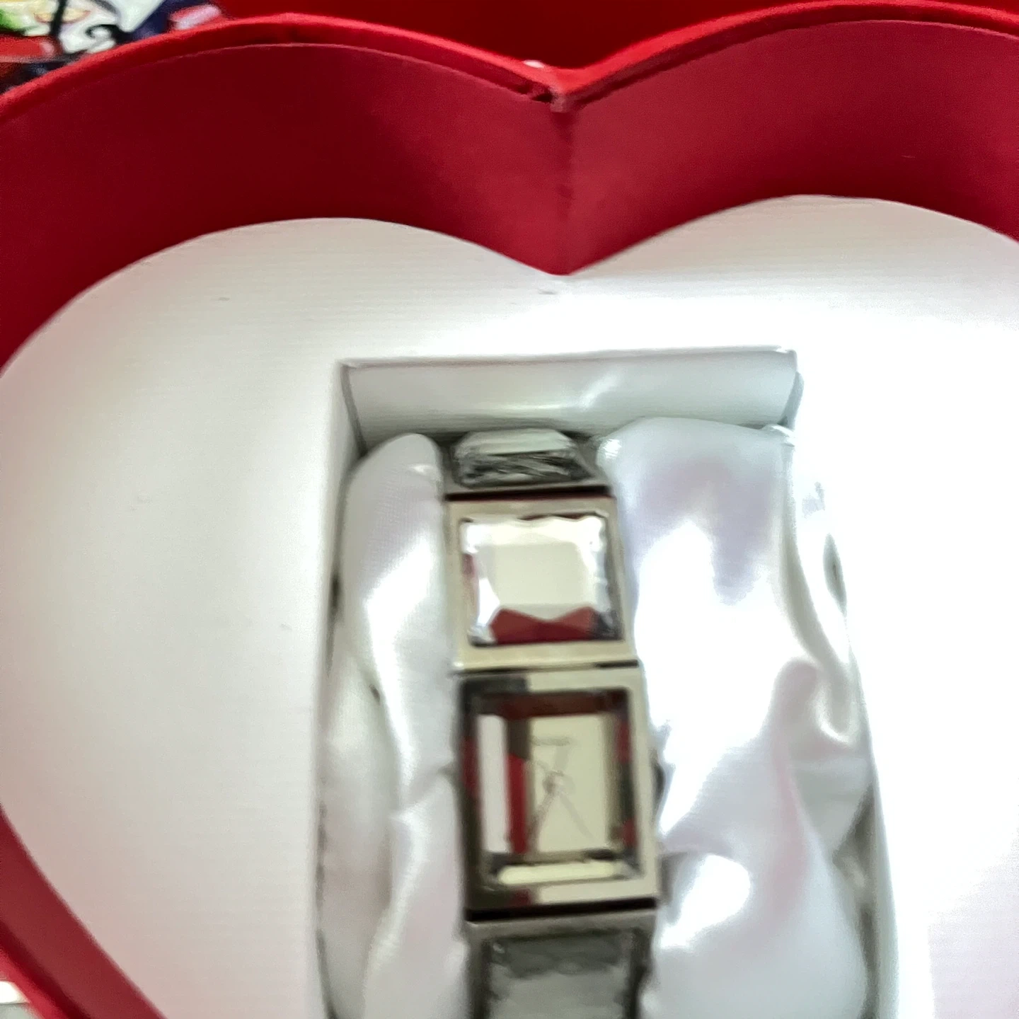 Selling this ladies' bracelet watch. It comes in a cute heart-shaped box. The watch has a silver-tone finish with square details. Perfect as a gift or for yourself!