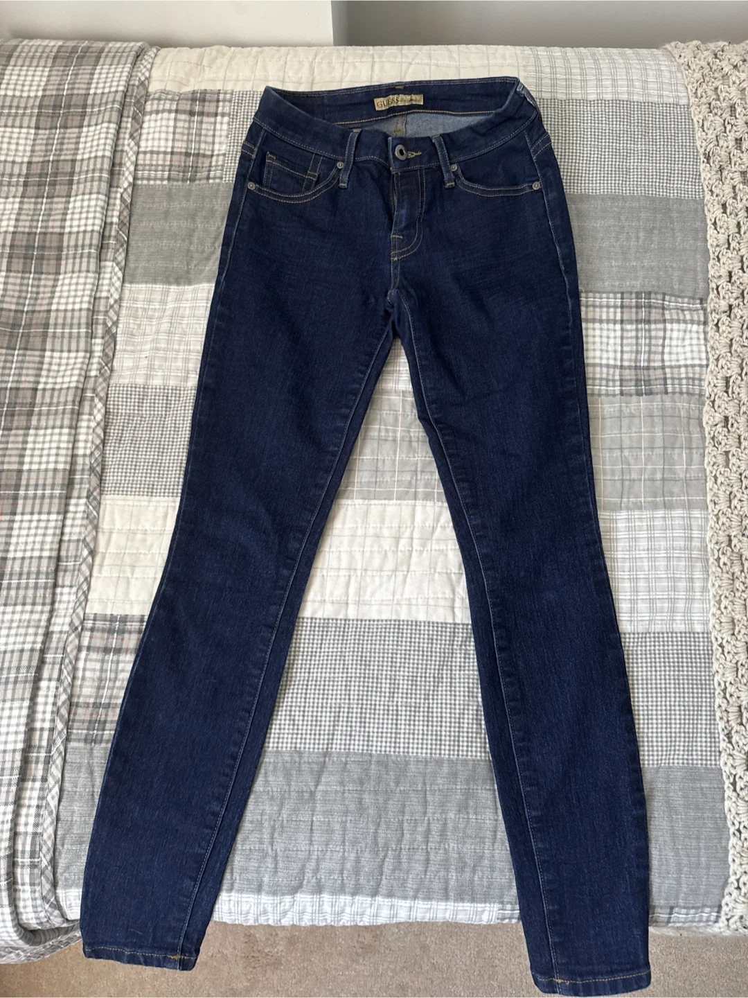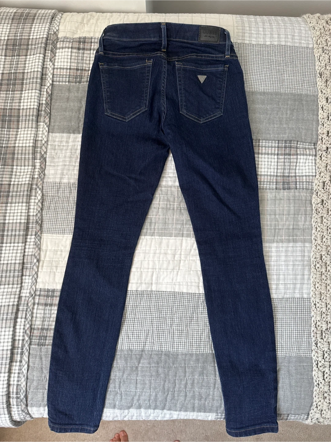 Selling a pair of Guess dark wash skinny jeans in size 26. They're in great condition and have the classic Guess logo on the back pocket. Perfect for everyday wear!