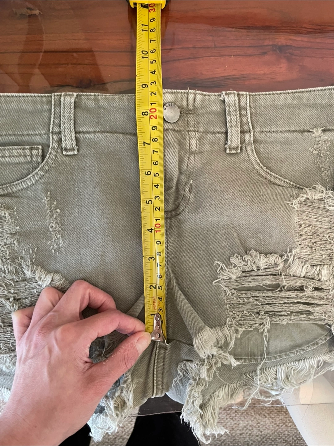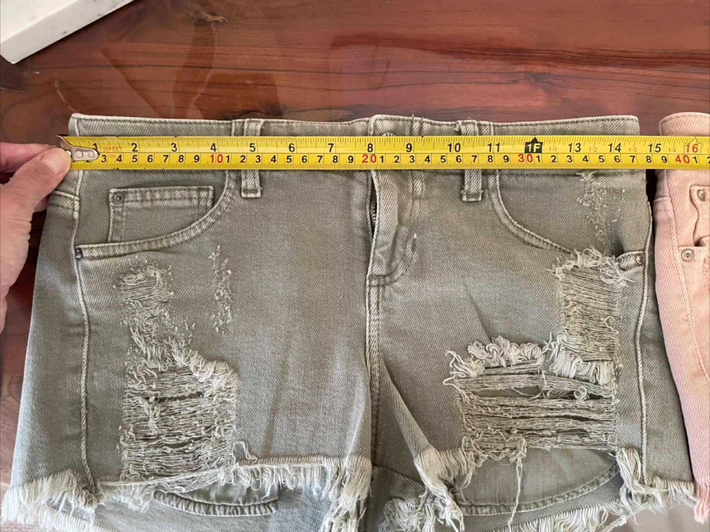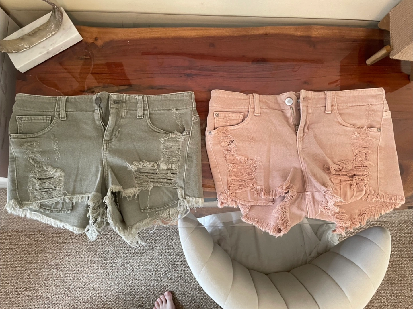 Stylish distressed jean shorts by Guess. Features frayed hems. Available in olive and blush colors. Pick up only, Pape and Danforth, no holds sorry.