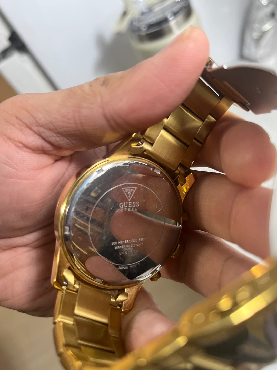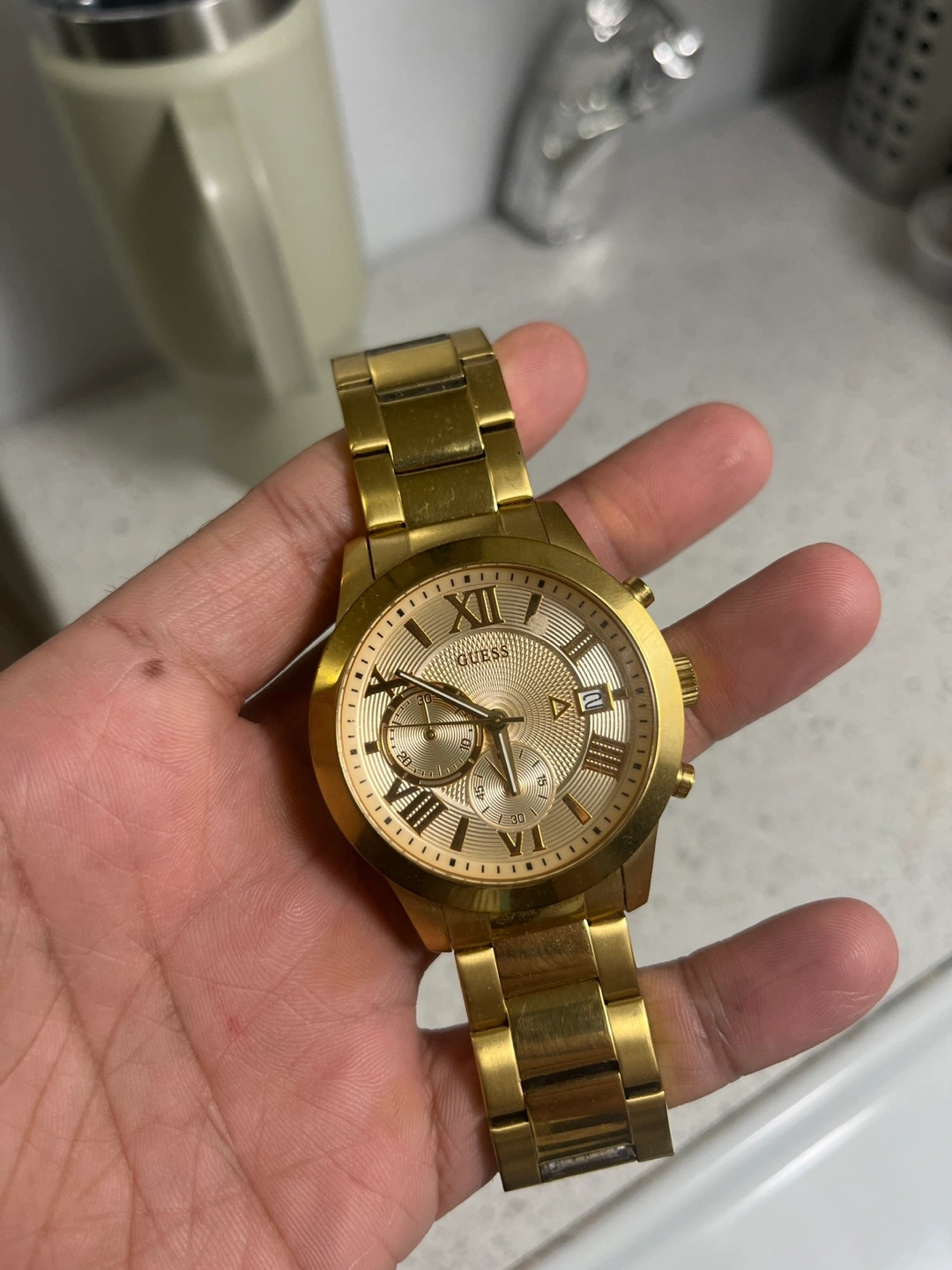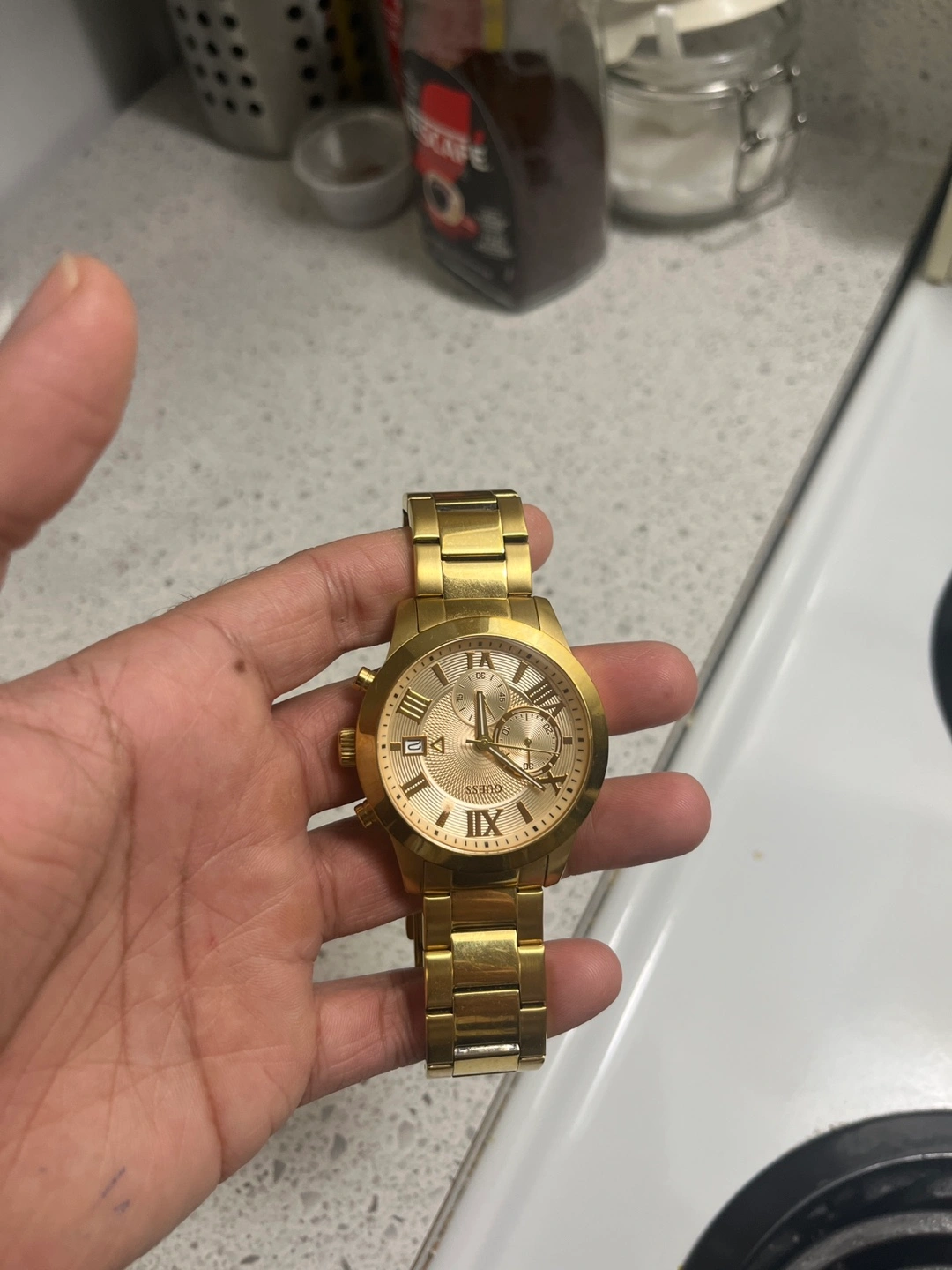 Gold toned watch with chronograph function. Features a gold tone band and face. Needs a battery change.