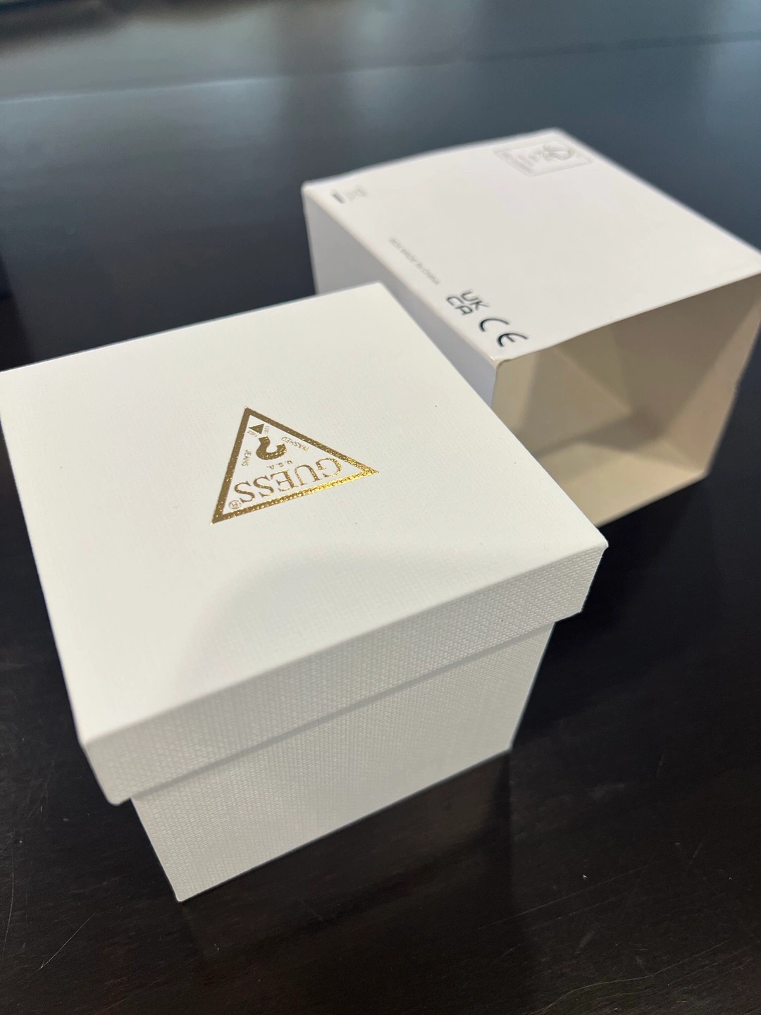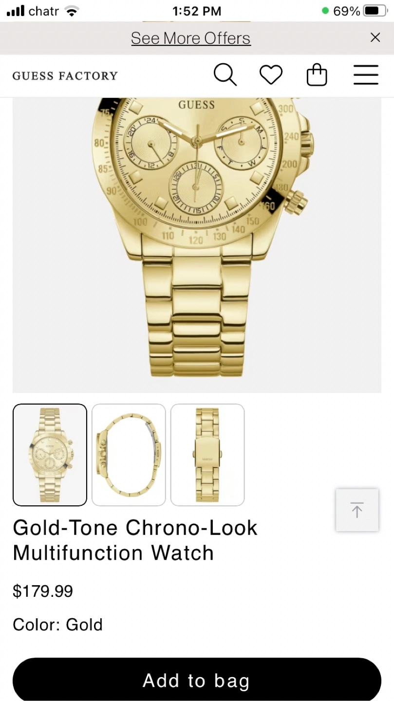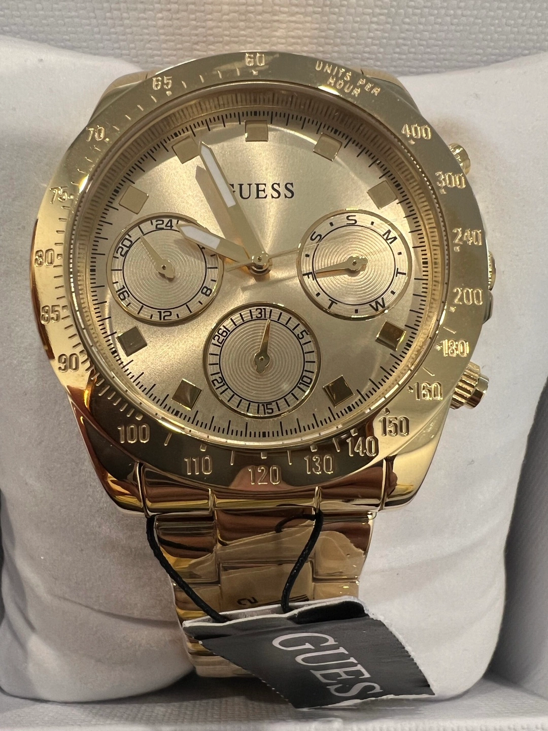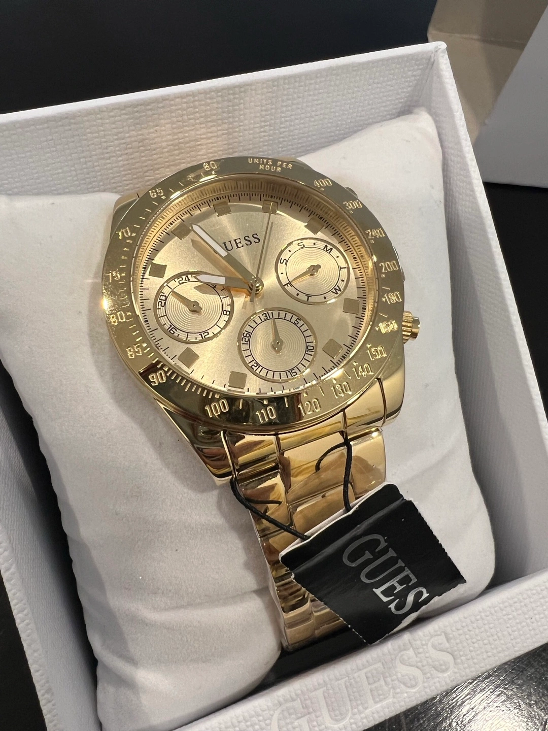 Selling a Guess gold-tone chrono-look multifunction watch! It comes with its original box. Retails for $179.99