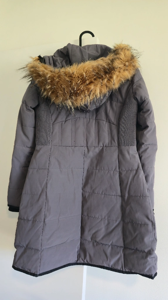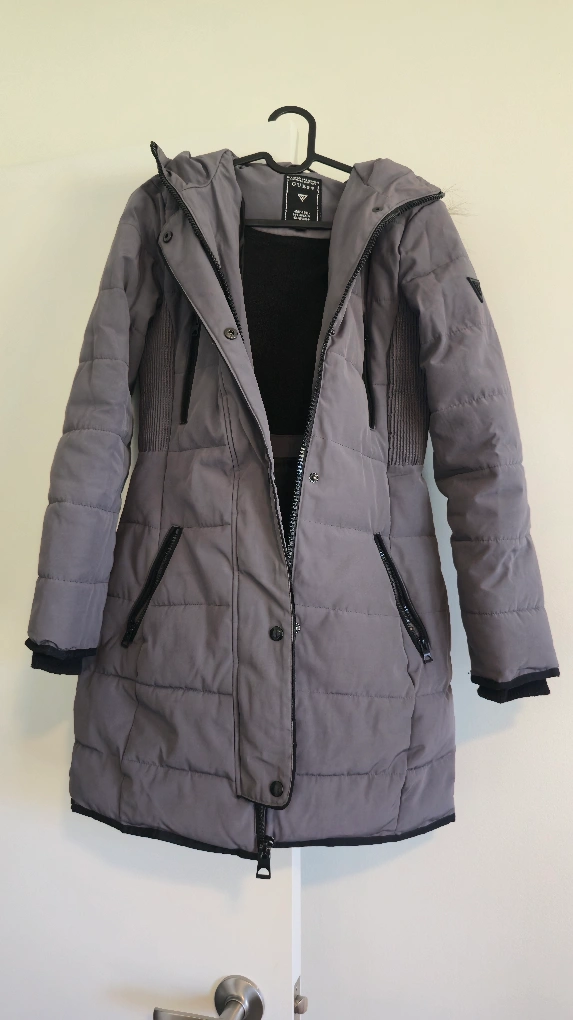 Cozy grey puffer coat from GUESS, perfect for chilly Canadian weather! It's a size XS and features a faux fur trim on the hood. Great for staying warm and stylish!