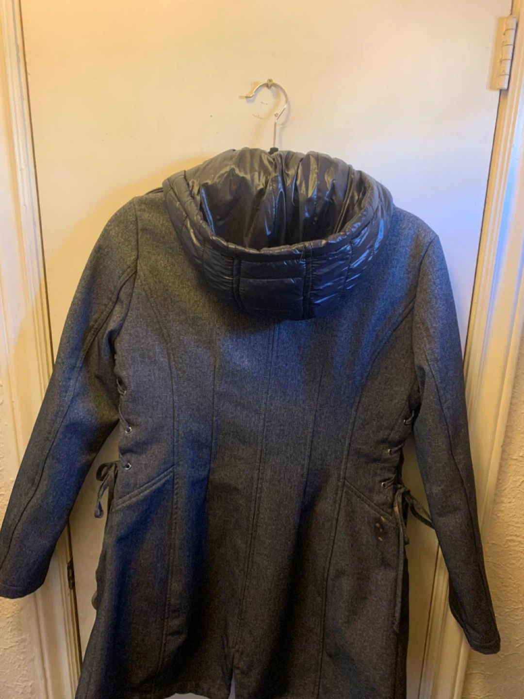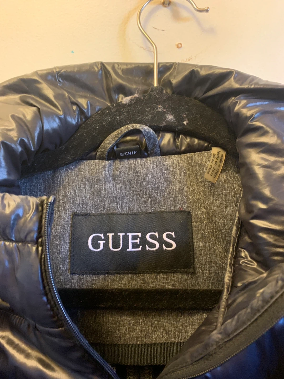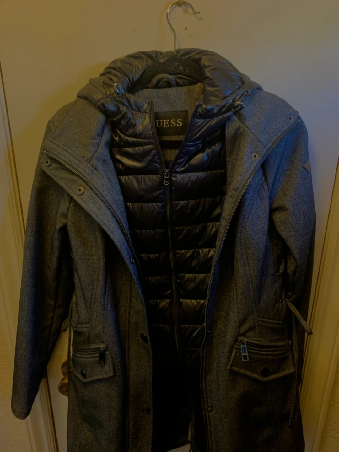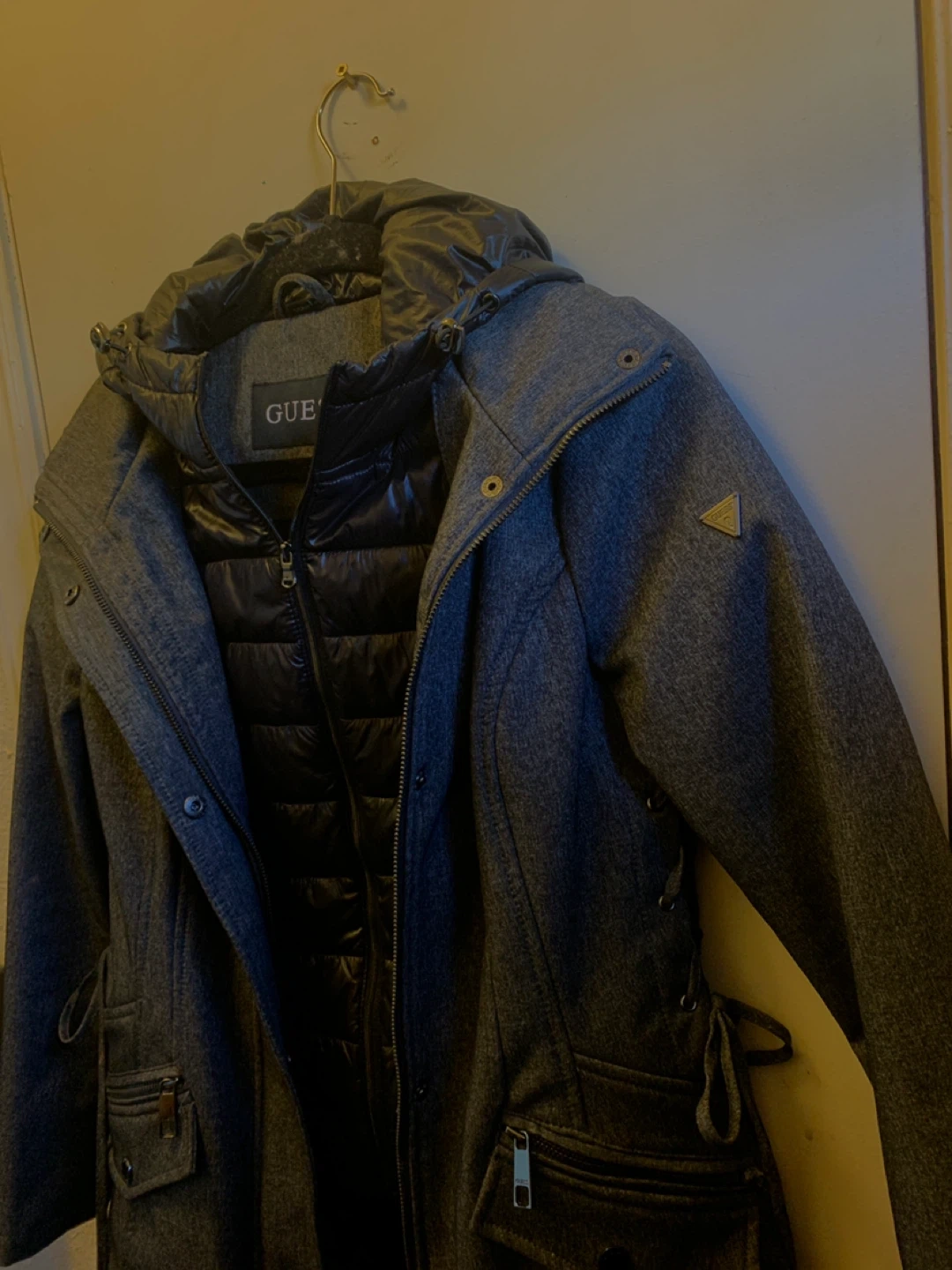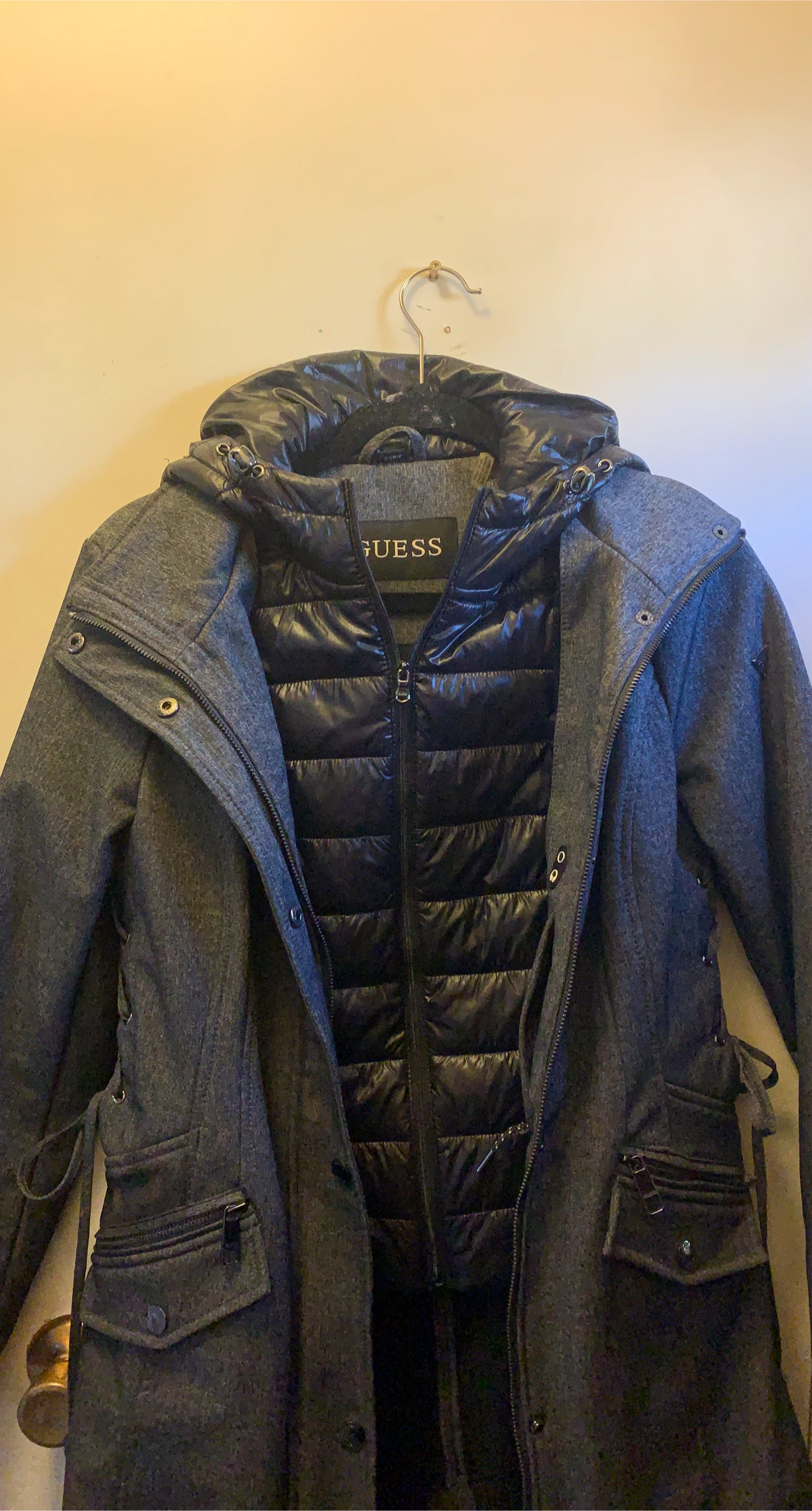 Selling a Guess grey wool blend coat. It's a size small. The coat features a stylish design with a wool blend exterior and a black puffer-style lining. Perfect for staying warm and fashionable!