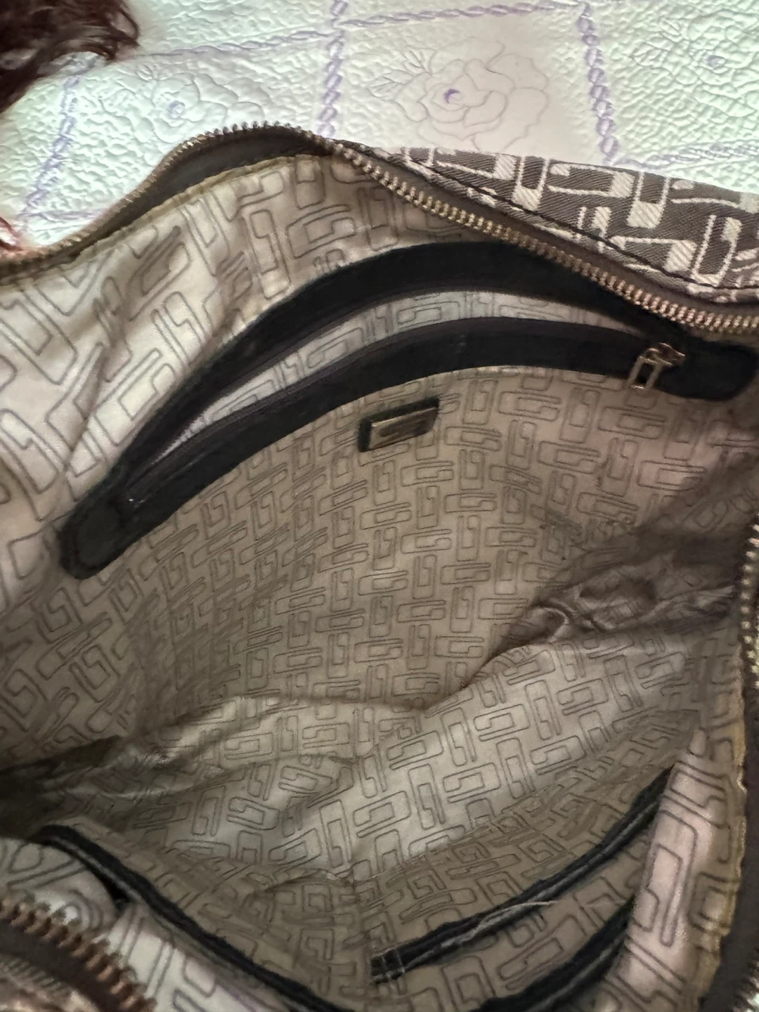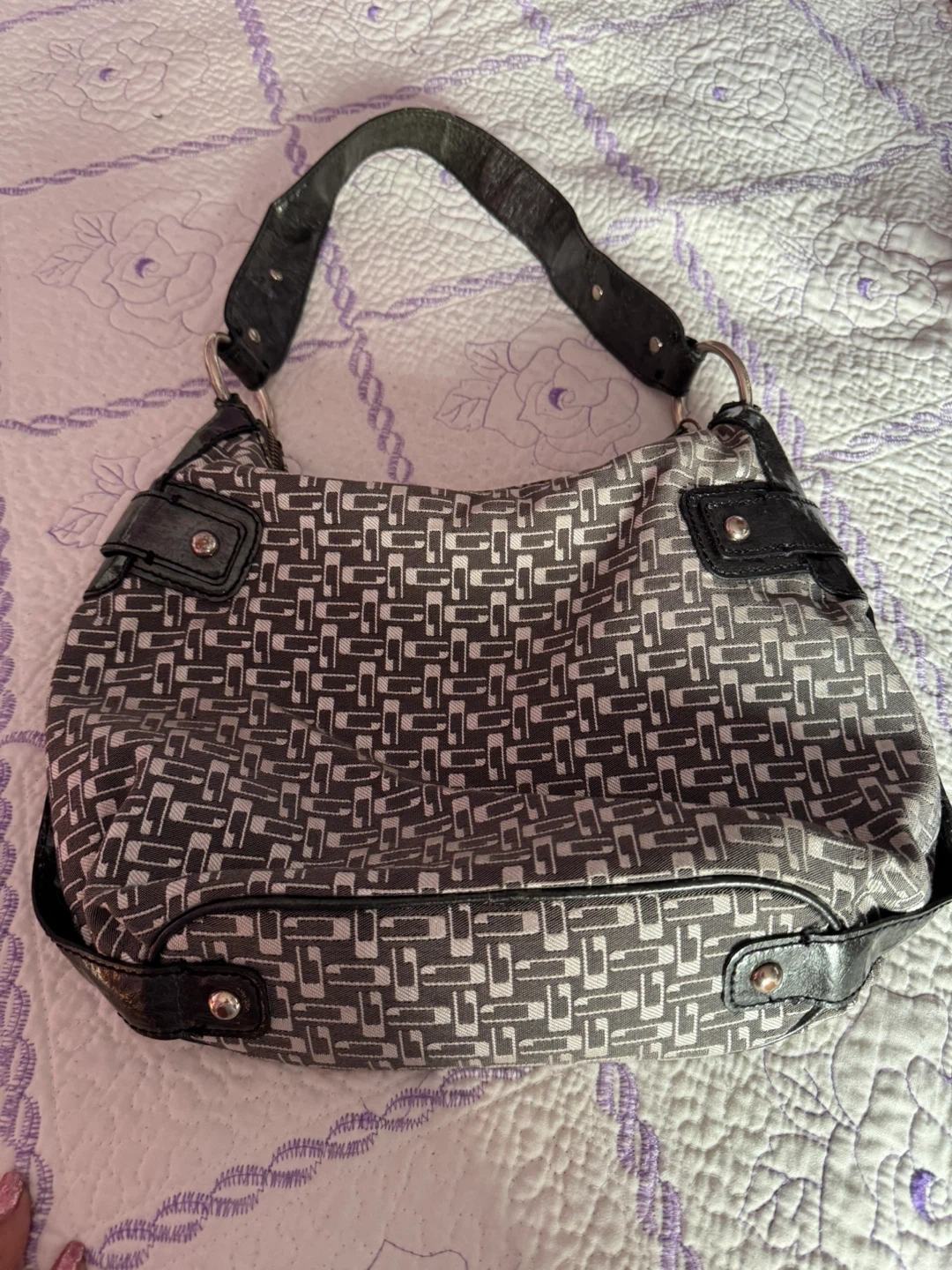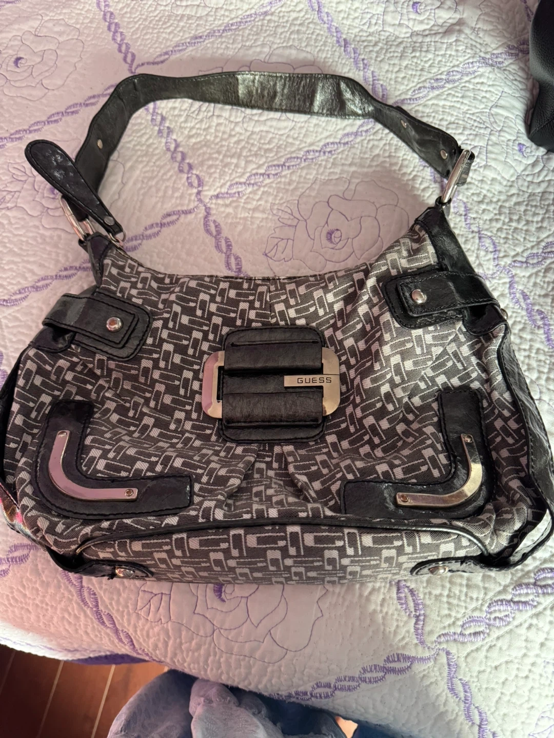 Selling a Guess handbag in good condition! It's a stylish purse with a unique pattern and black accents. Perfect for everyday use!