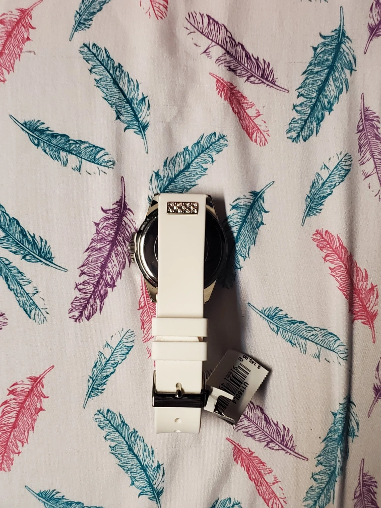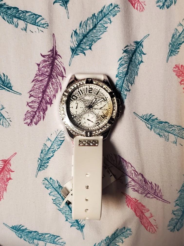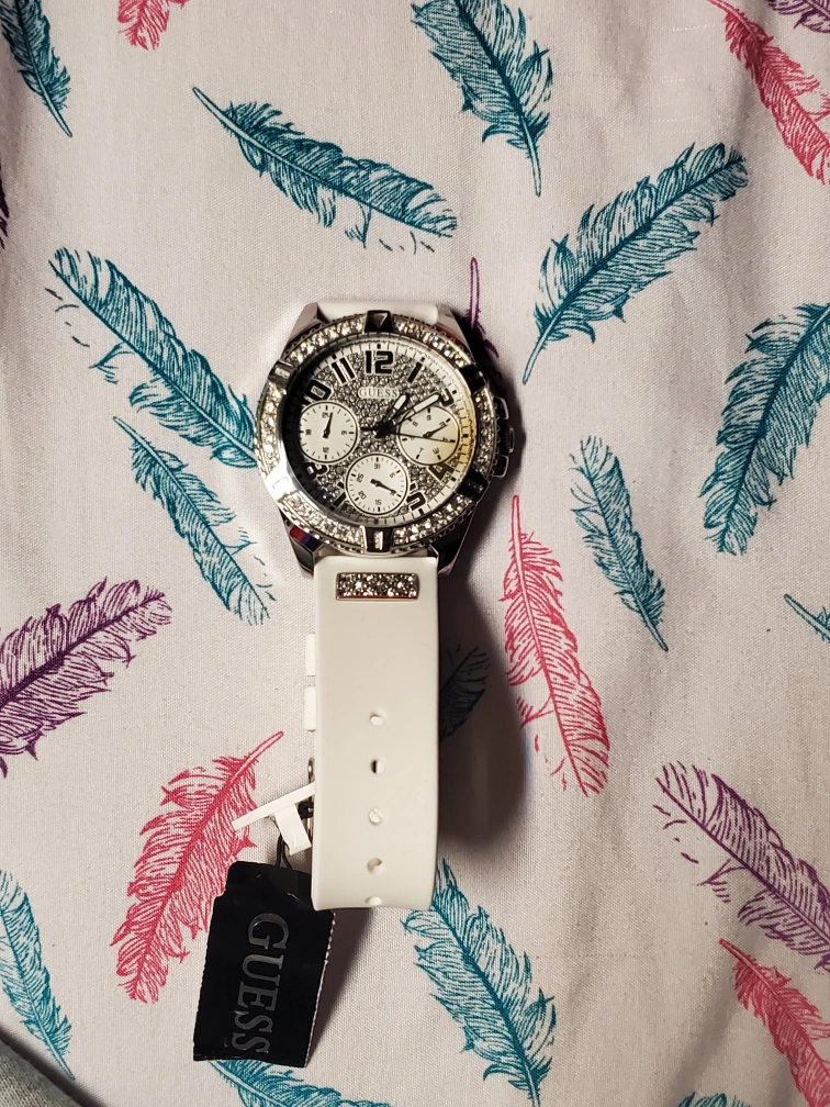 Selling a brand new Guess ladies watch with a white band. It's still got the tags on it, so it's in perfect condition! The dial is silver and the bezel is encrusted with rhinestones, giving it a sparkly look. The original price on the tag is $165.00. The stain in the picture is not on the watch, but in the protective sticker