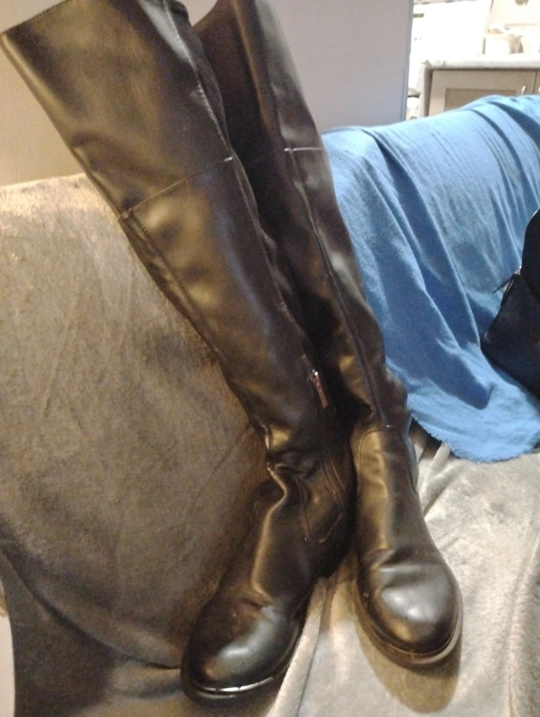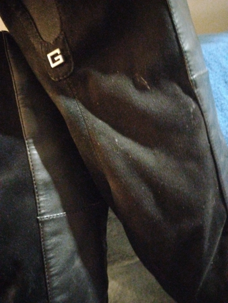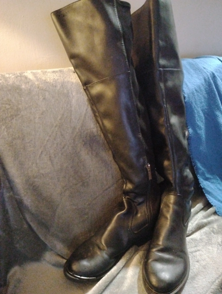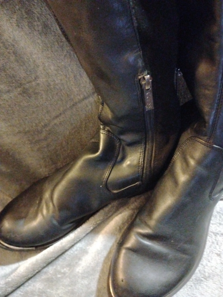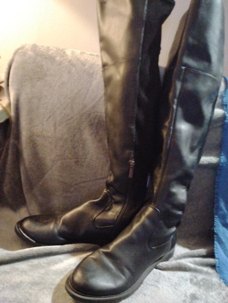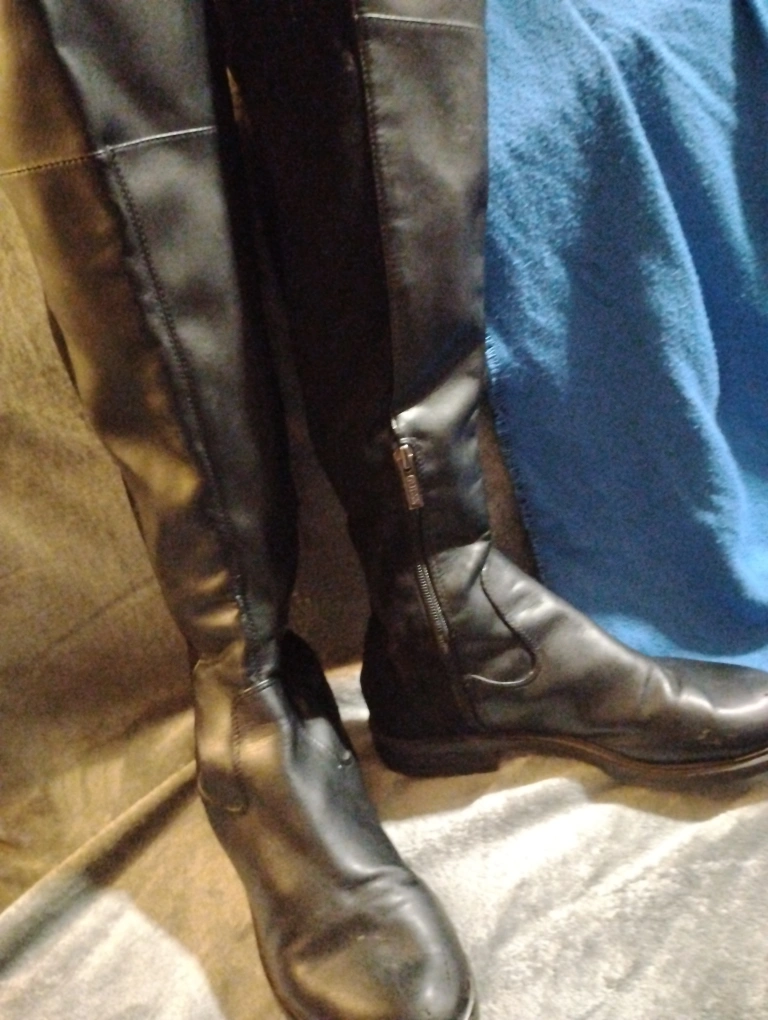these are really cool boots that are high over the knee and they are suede leather in the front and so and suede on the side they got zippers at the ankles and then zippers at the top and they just look really really hip.
