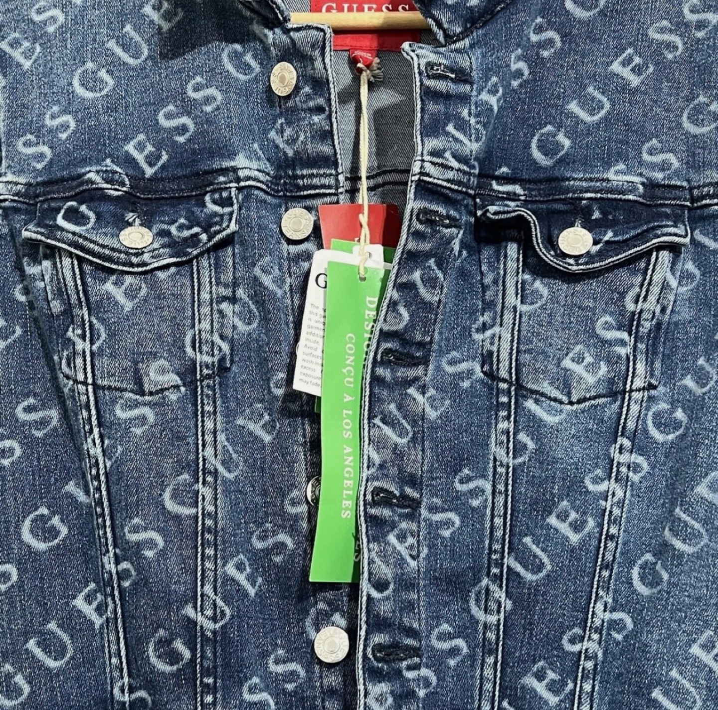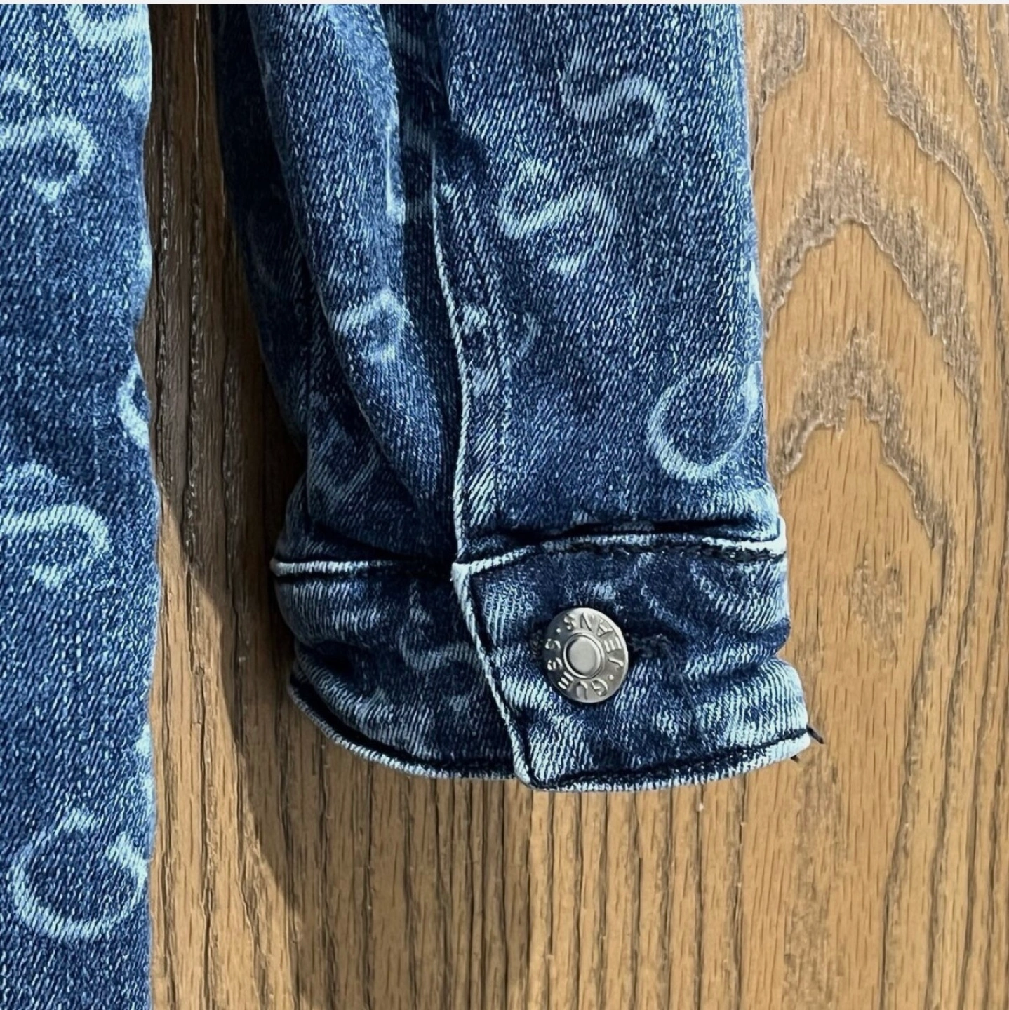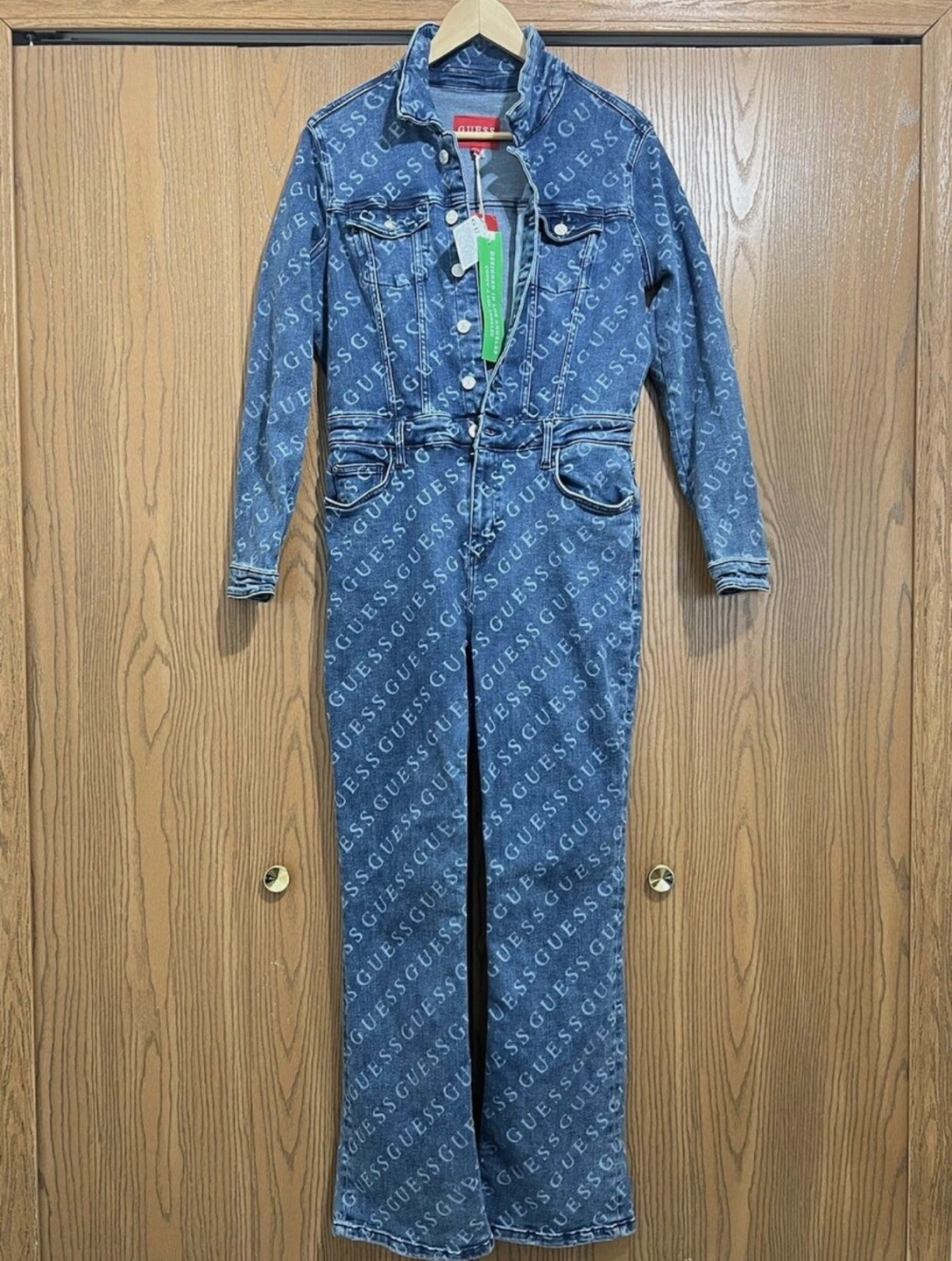 Women's Guess denim jumpsuit. Medium wash. All-over Guess logo print. Long sleeves. Button closure. Size Medium. $178.00 US$ retail price.