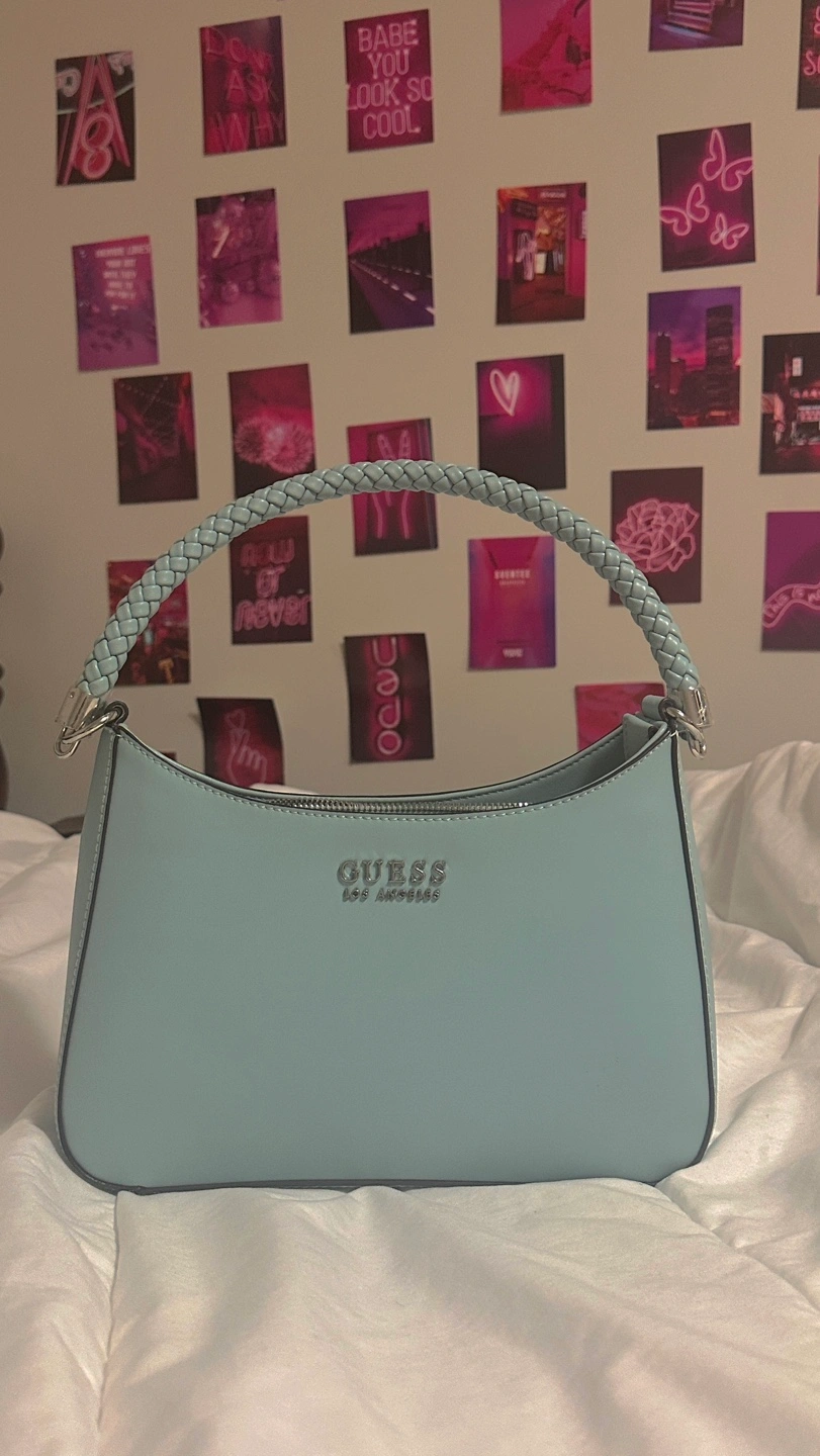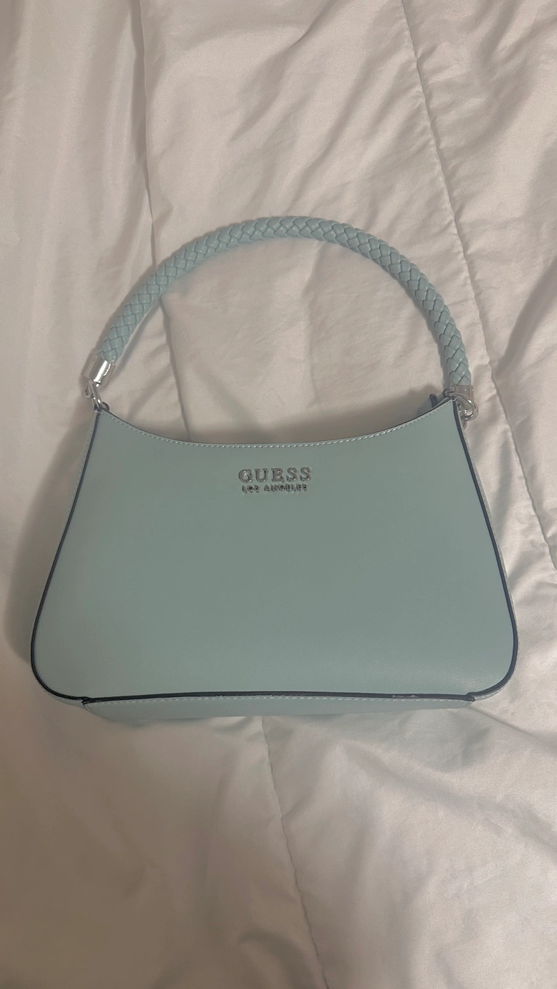 Small light blue Guess handbag. Features a braided top handle and silver Guess logo. Zipper closure. Excellent condition.