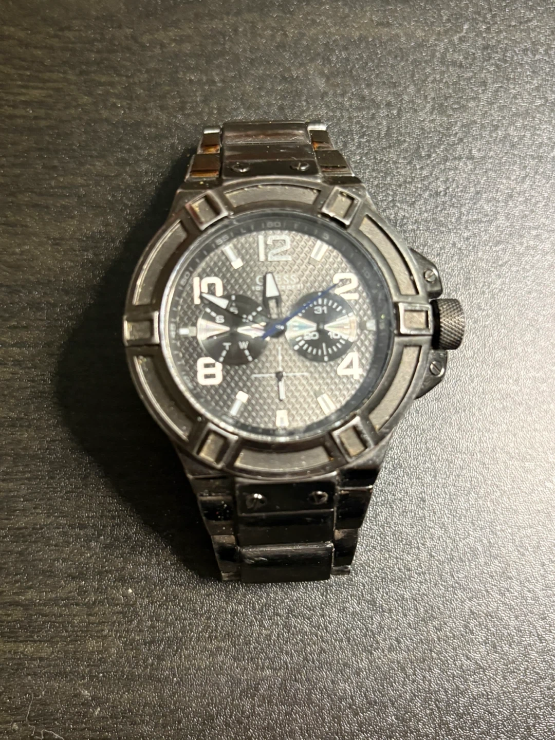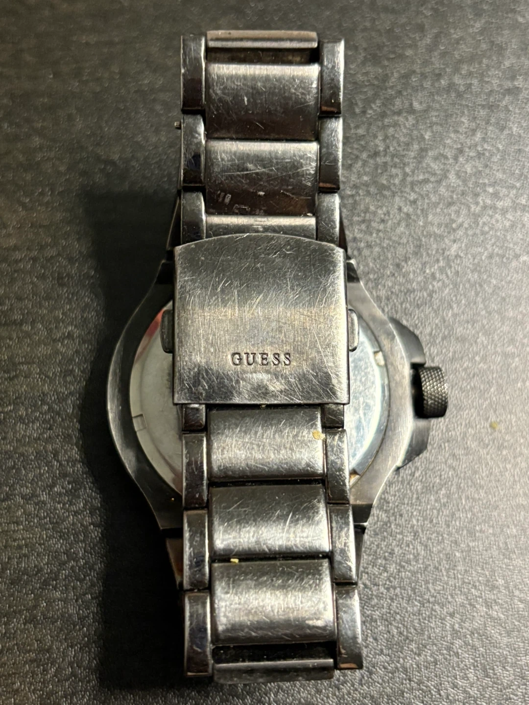 Selling a Guess men's watch in black. It's a stylish timepiece that would look great for everyday wear. It has a stainless steel band and a striking black dial. Feel free to reach out if you're interested! Pick up only