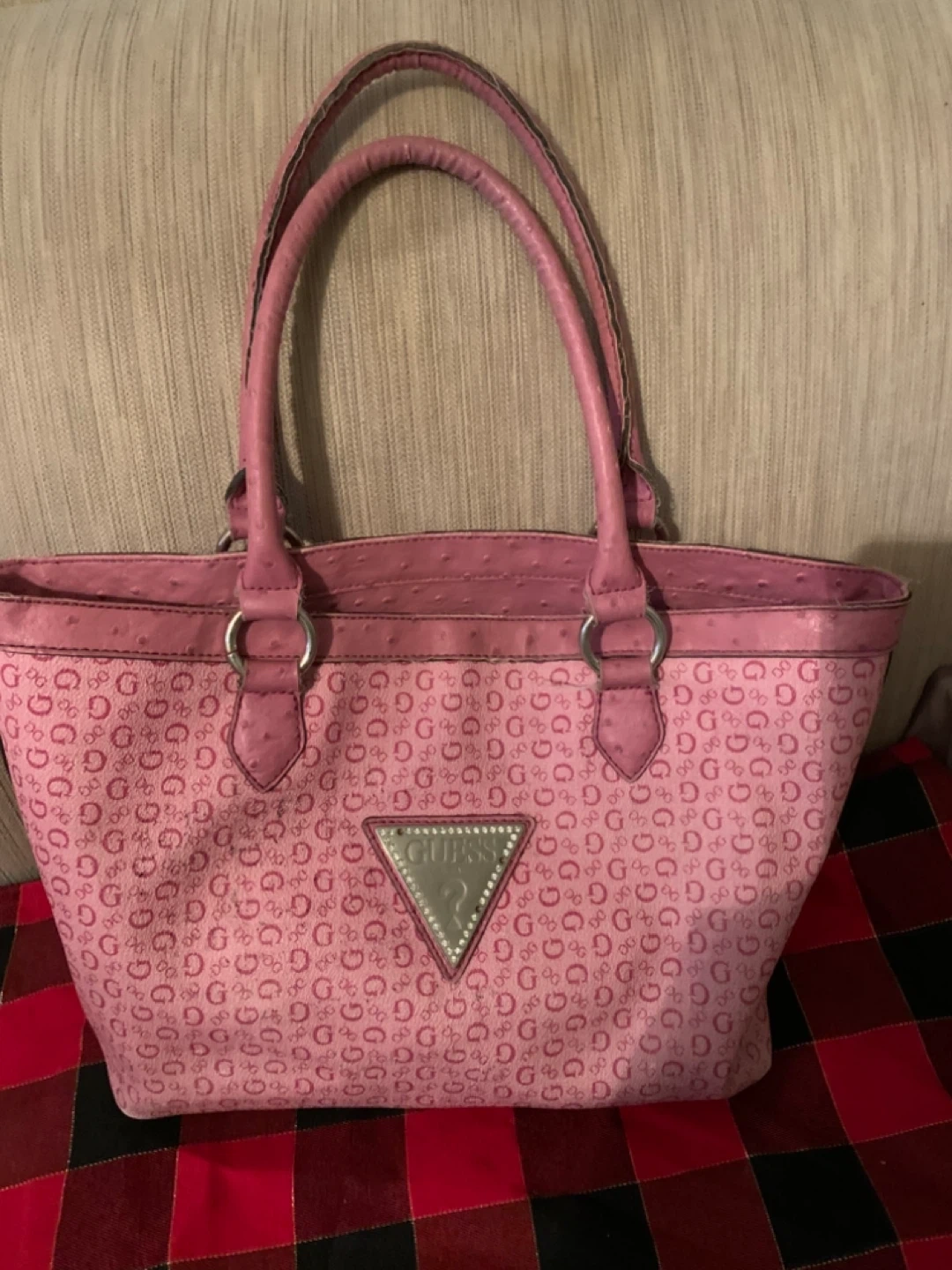 Selling a cute Guess tote bag in pink! It has a fun all-over 'G' logo print and a spacious interior with a cool print lining. Perfect for everyday use!