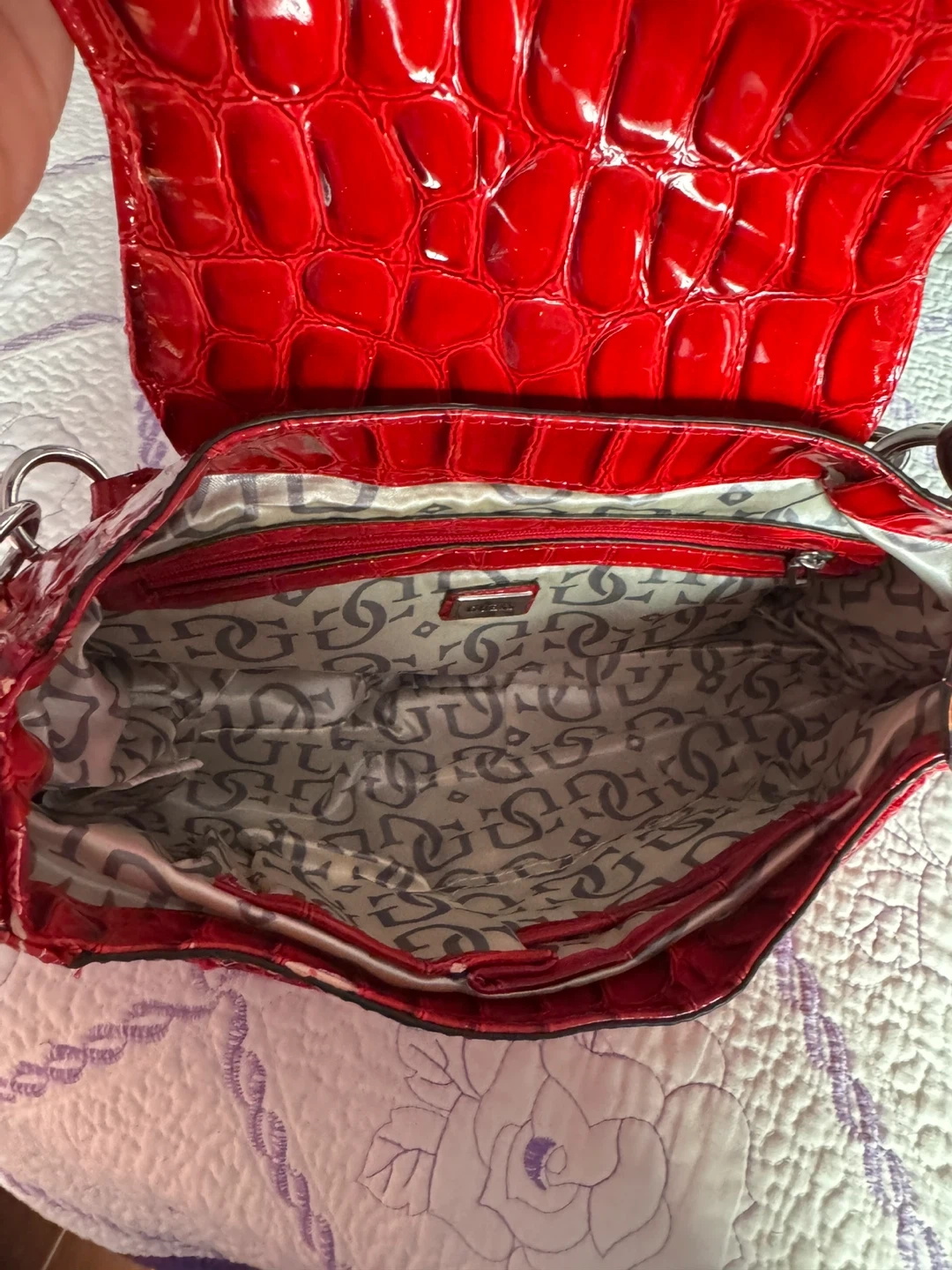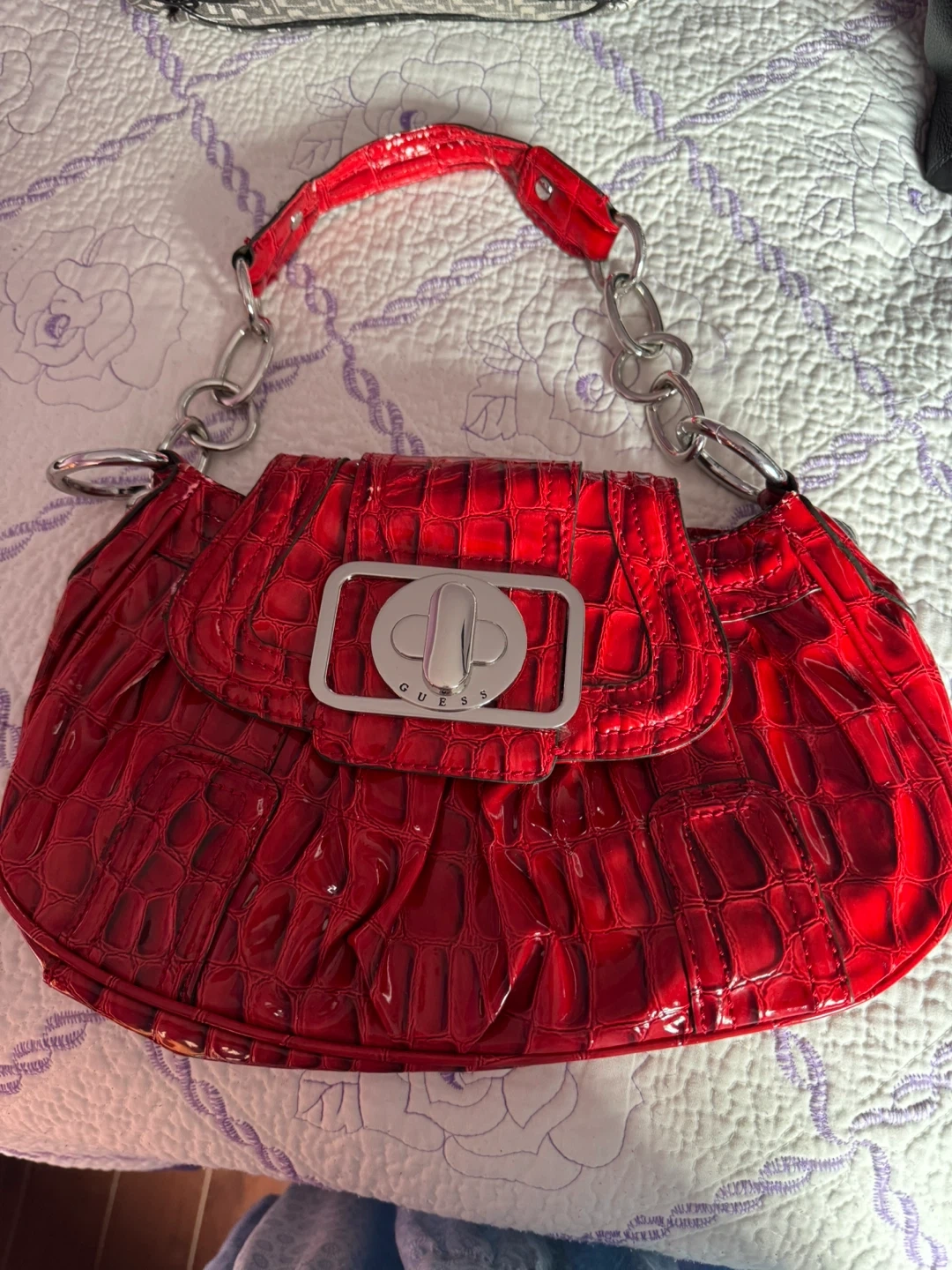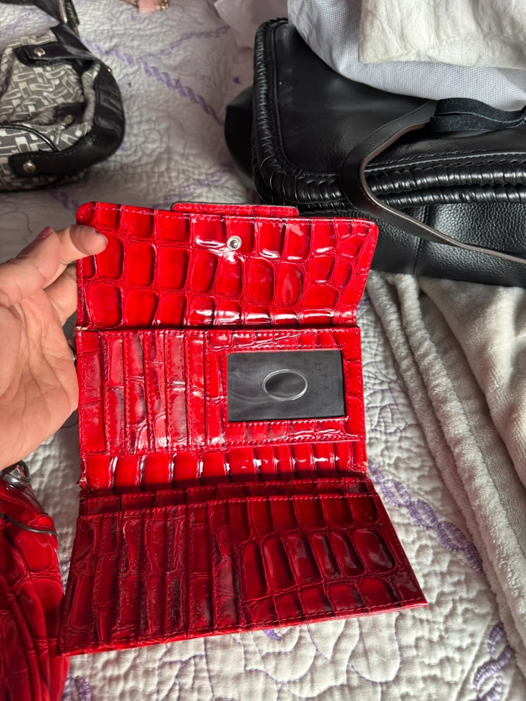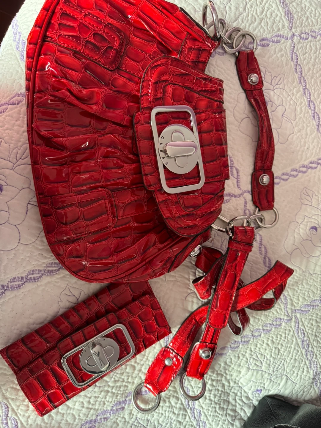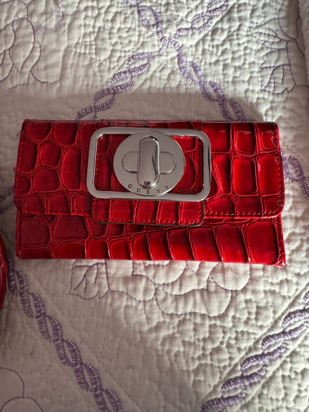 Selling a vibrant red Guess purse and matching wallet! The purse features a stylish croc-embossed pattern and silver-tone hardware. The wallet has a similar design and offers plenty of space for cards and cash. Perfect for adding a pop of colour to your outfit!