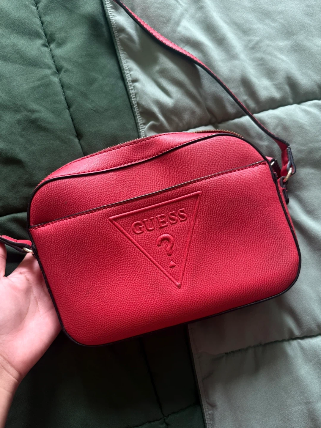 There’s a scratch on the strip. (Check pictures) Selling a cute red crossbody bag from Guess! It's in great condition and perfect for everyday use. The interior has the Guess logo pattern. The colour is a vibrant red!