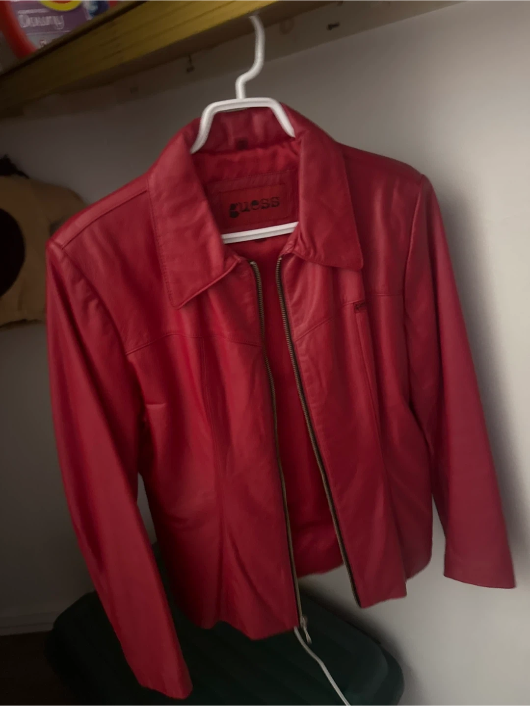 Selling a vibrant red leather jacket from Guess! It's in great condition and perfect for adding a pop of colour to your wardrobe. The jacket features a classic design with a zip-up front. It is a stylish choice for any occasion!