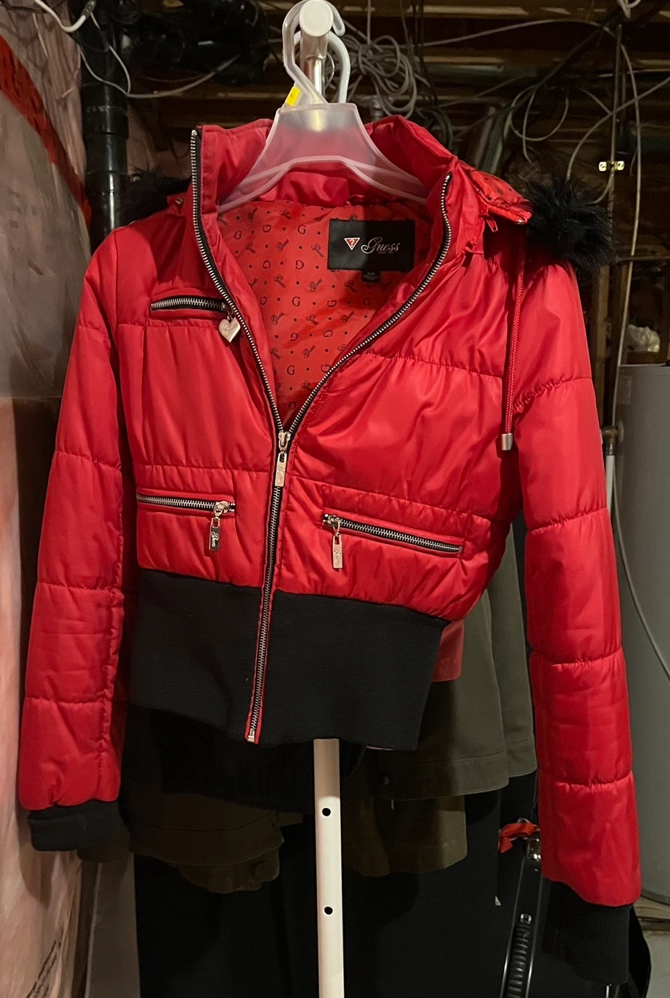Red puffer jacket with black trim. Has a hood with faux fur. Zipper closure with two zippered pockets in the front. Small size and perfect for the cool weather.