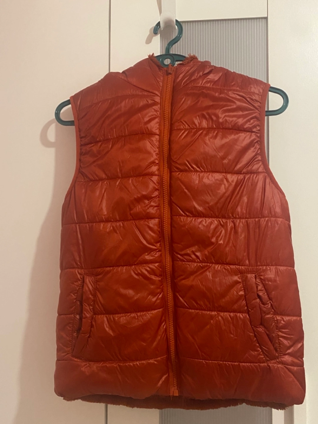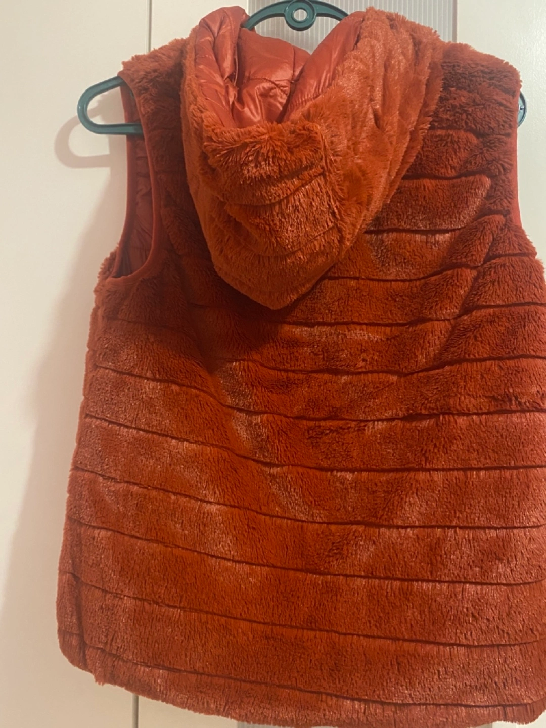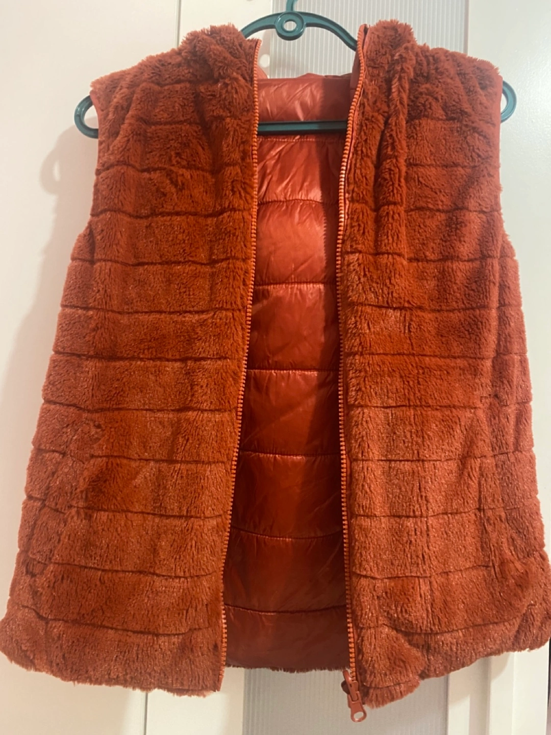 Beautiful reversible hooded vest in a burnt orange colour. Features a faux fur side and a quilted nylon side. Tag is hidden in the pocket. Zip closure. Size small. Excellent condition. Very comfy too, selling just because I don’t wear it as often as my jackets.