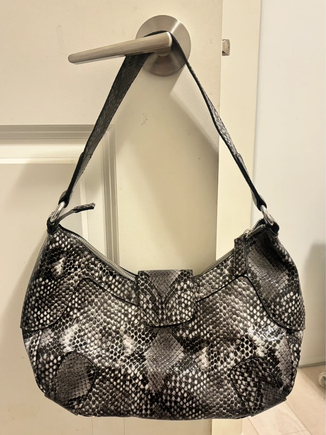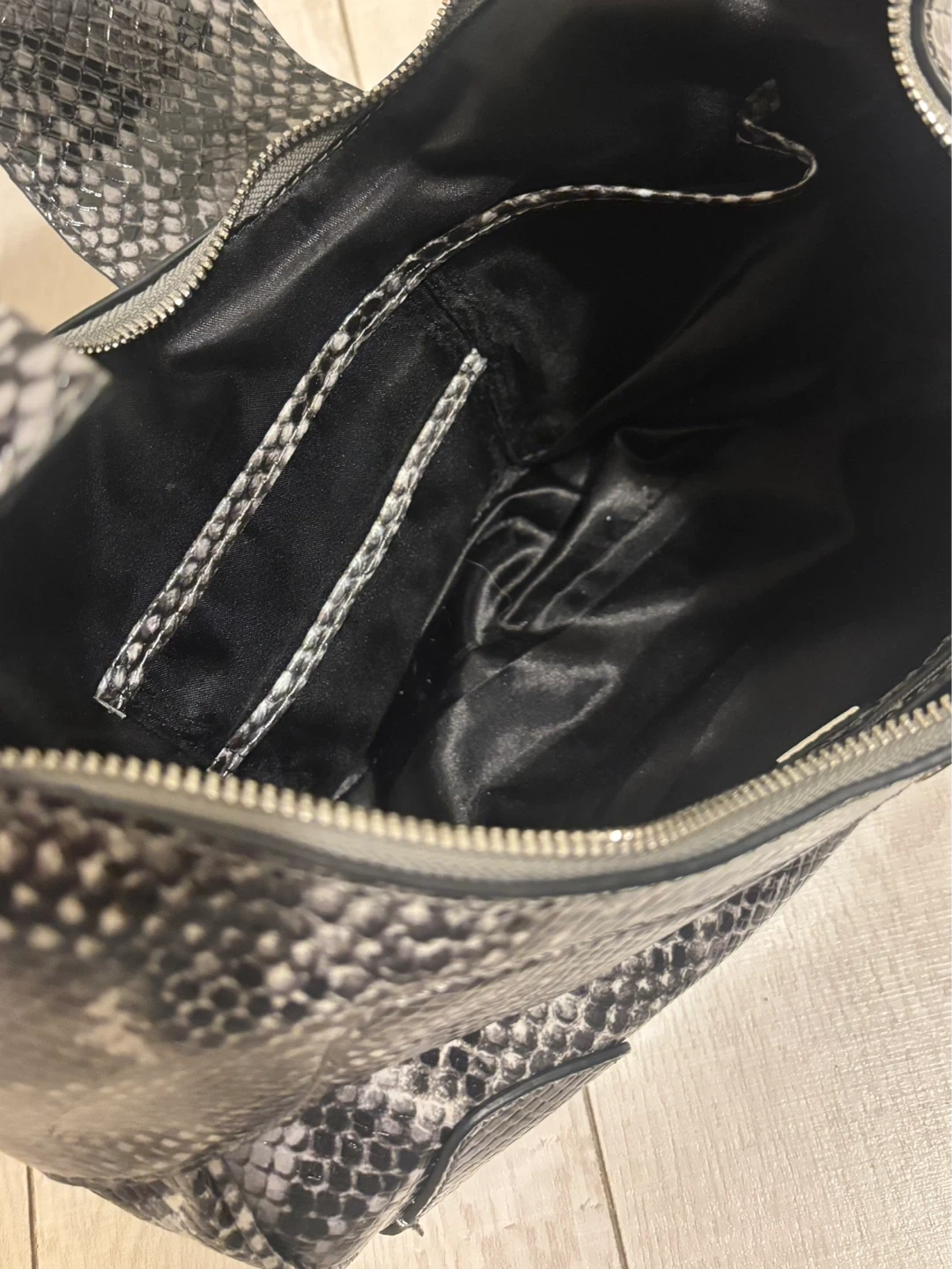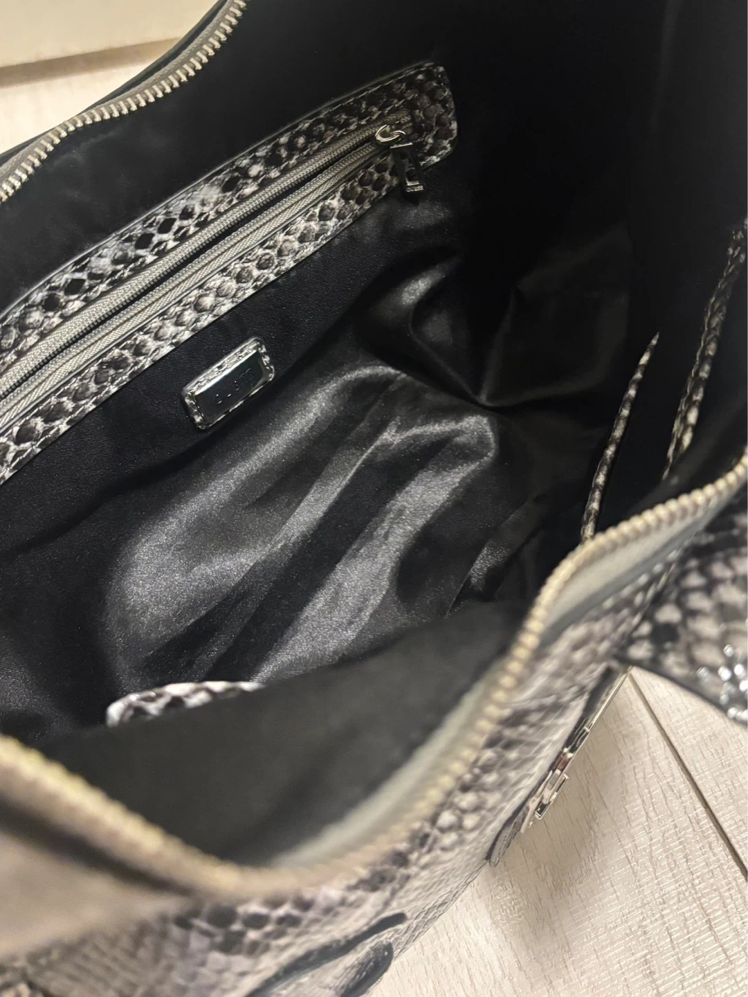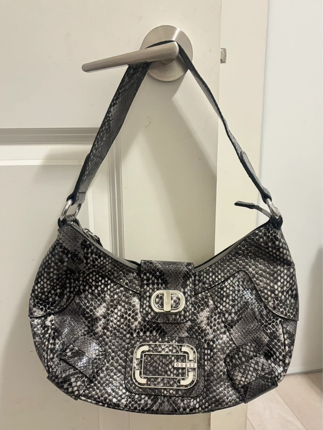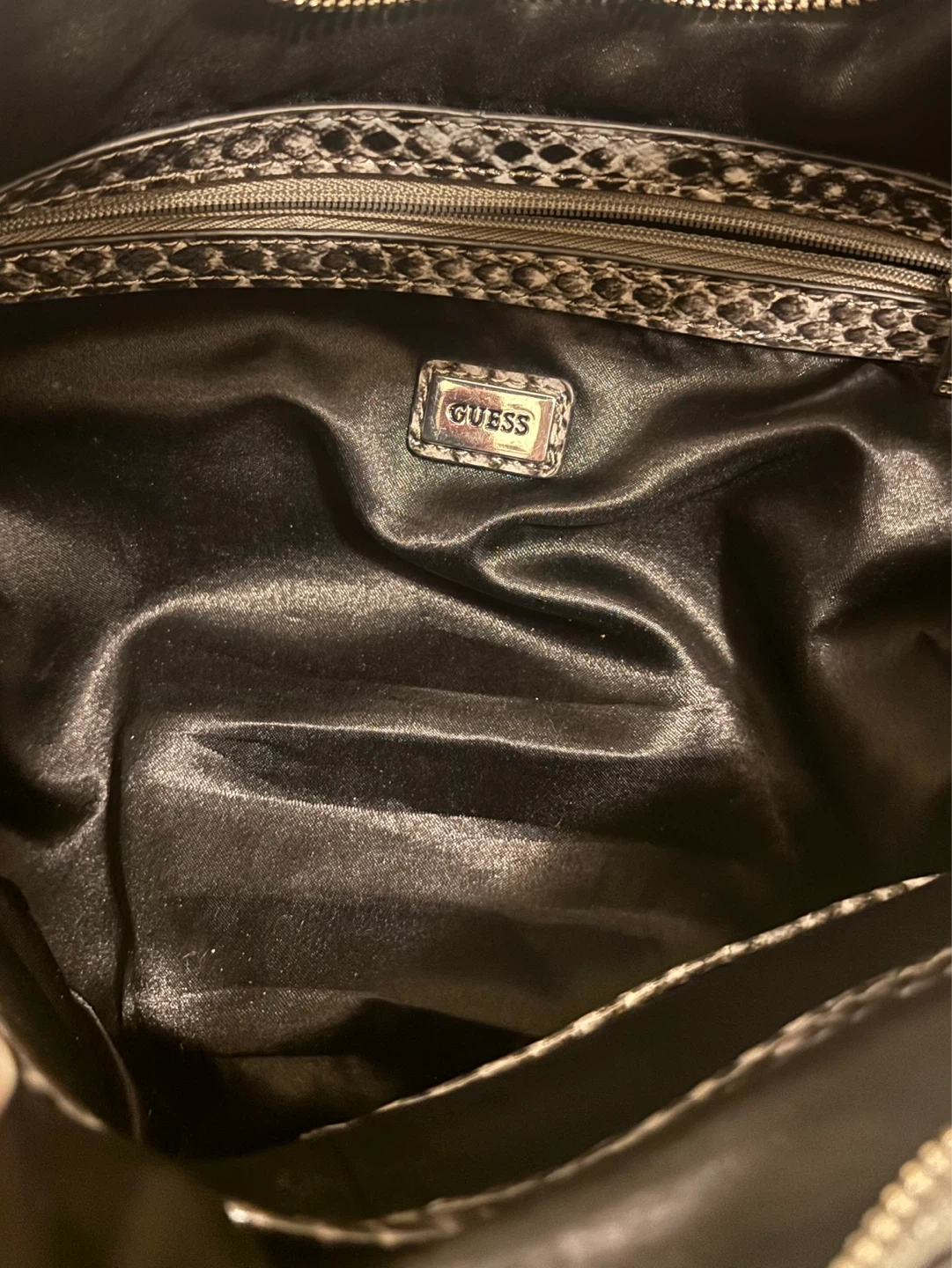 Stylish Guess shoulder bag with a snakeskin print. The interior is black with a zippered pocket and slip pockets.