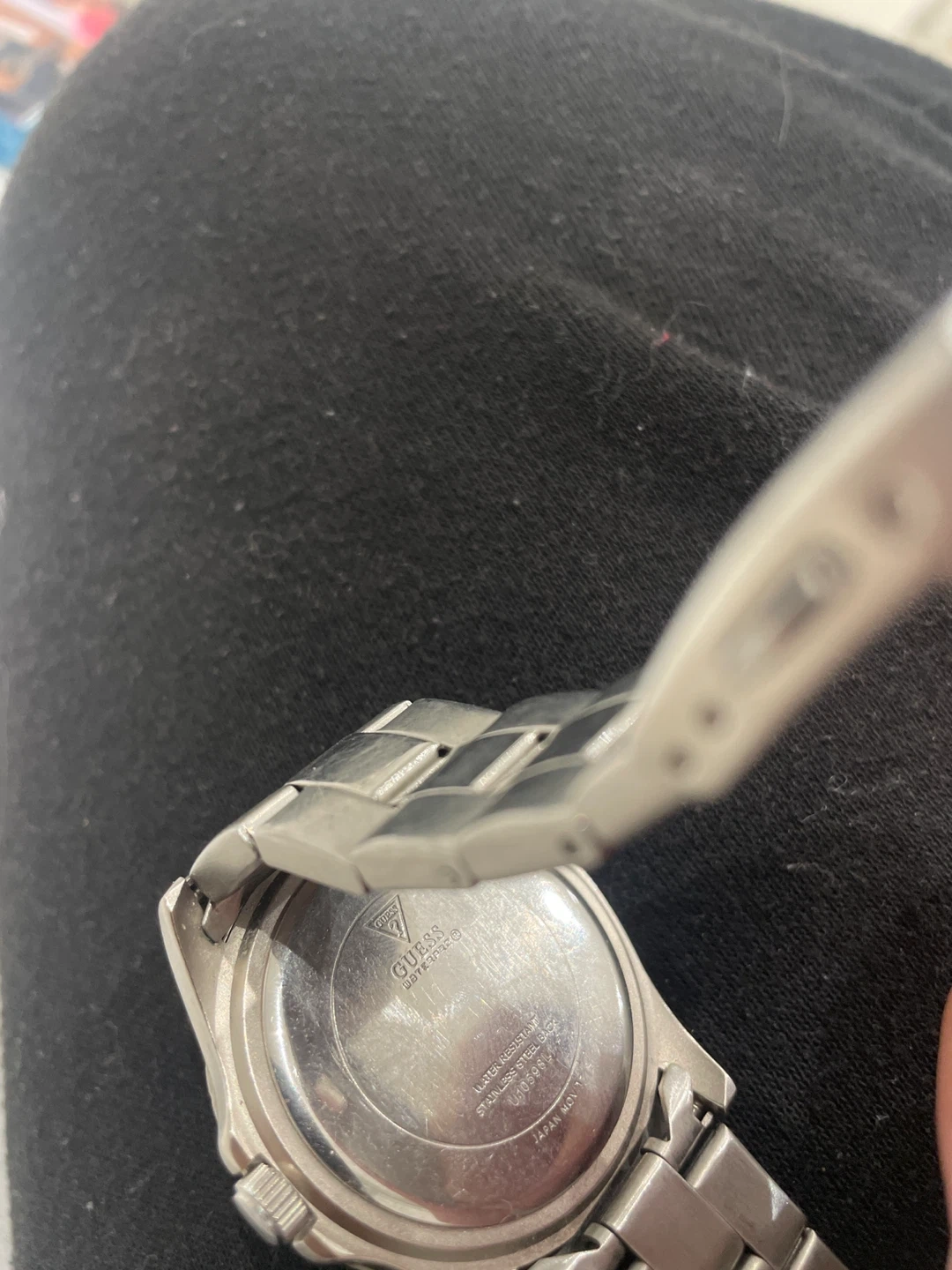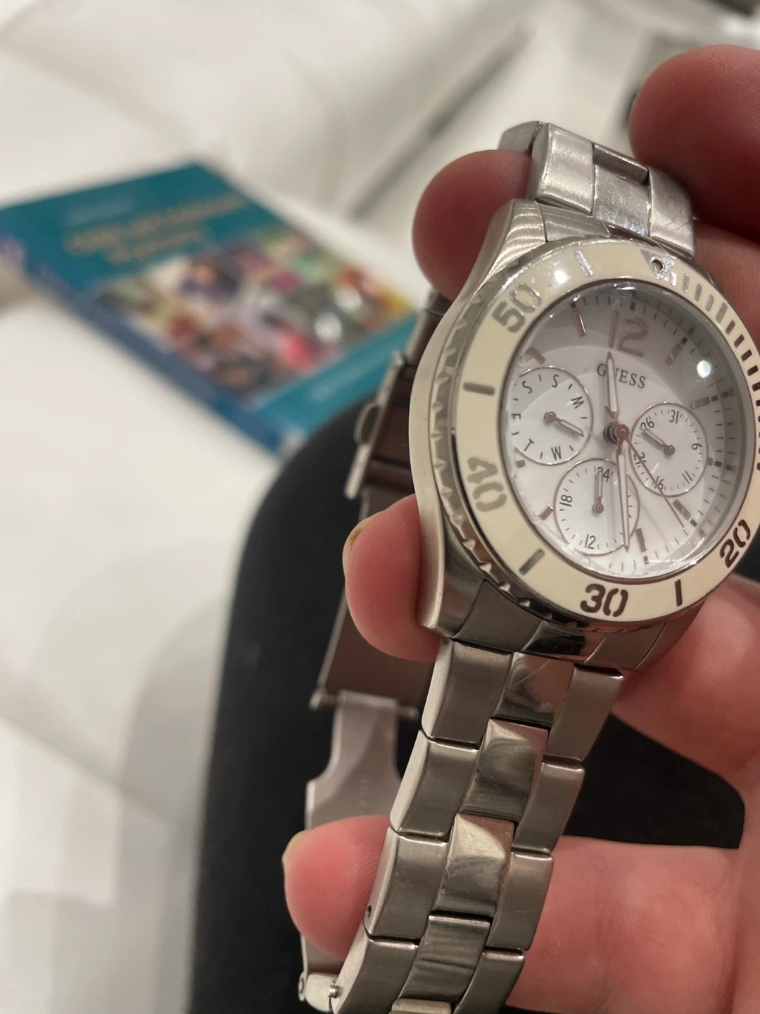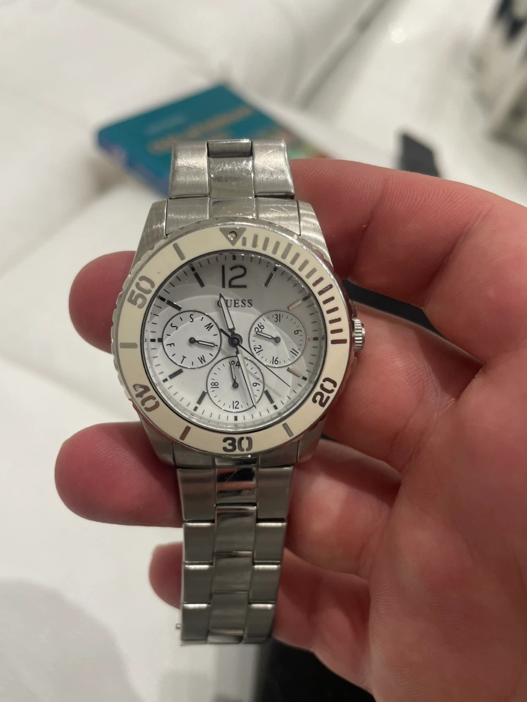 Selling a Guess silver-tone multifunction watch. It's in great condition and has a stylish, classic look. The watch features a stainless steel band and a white dial with multiple subdials. Perfect for everyday wear or special occasions!