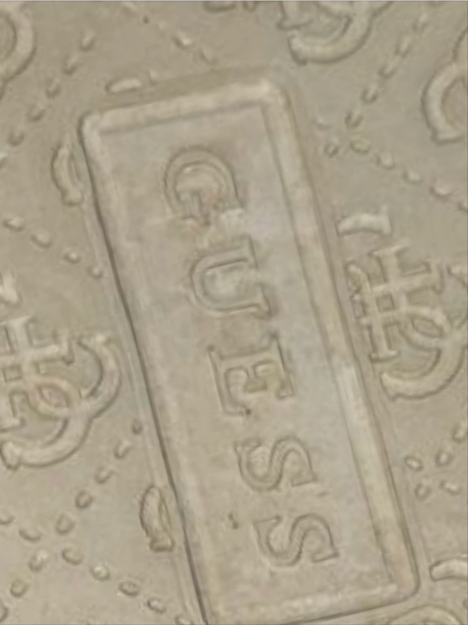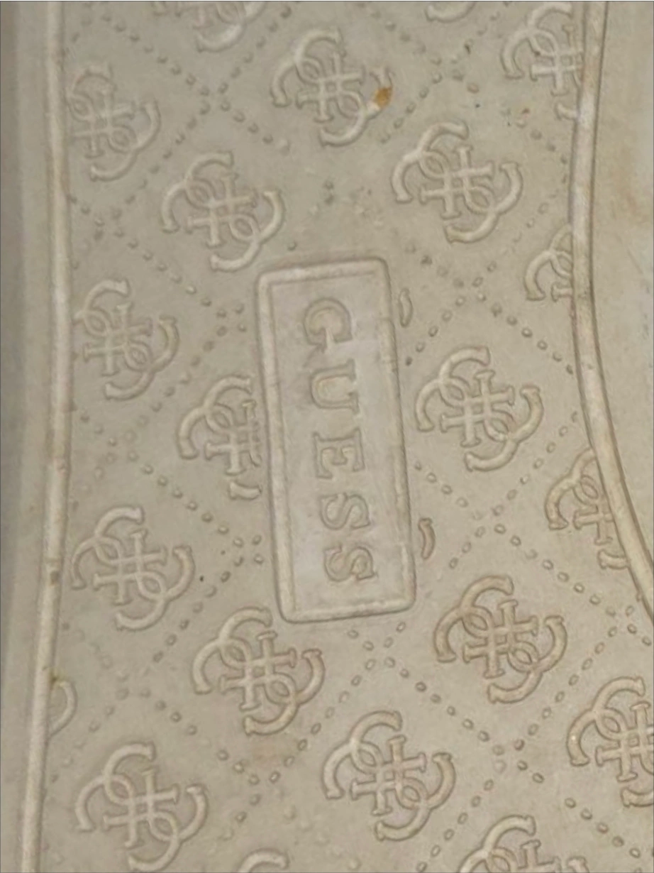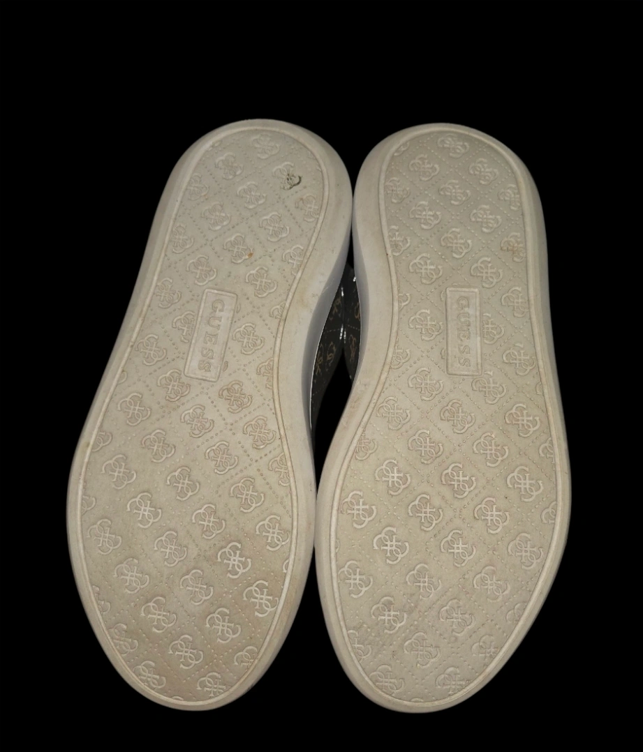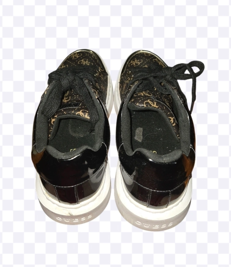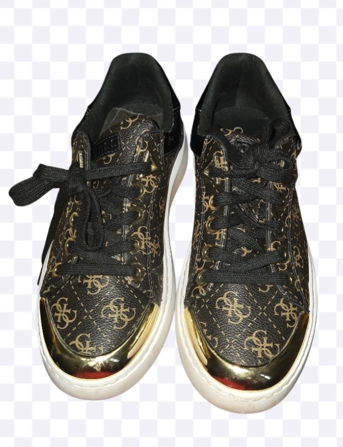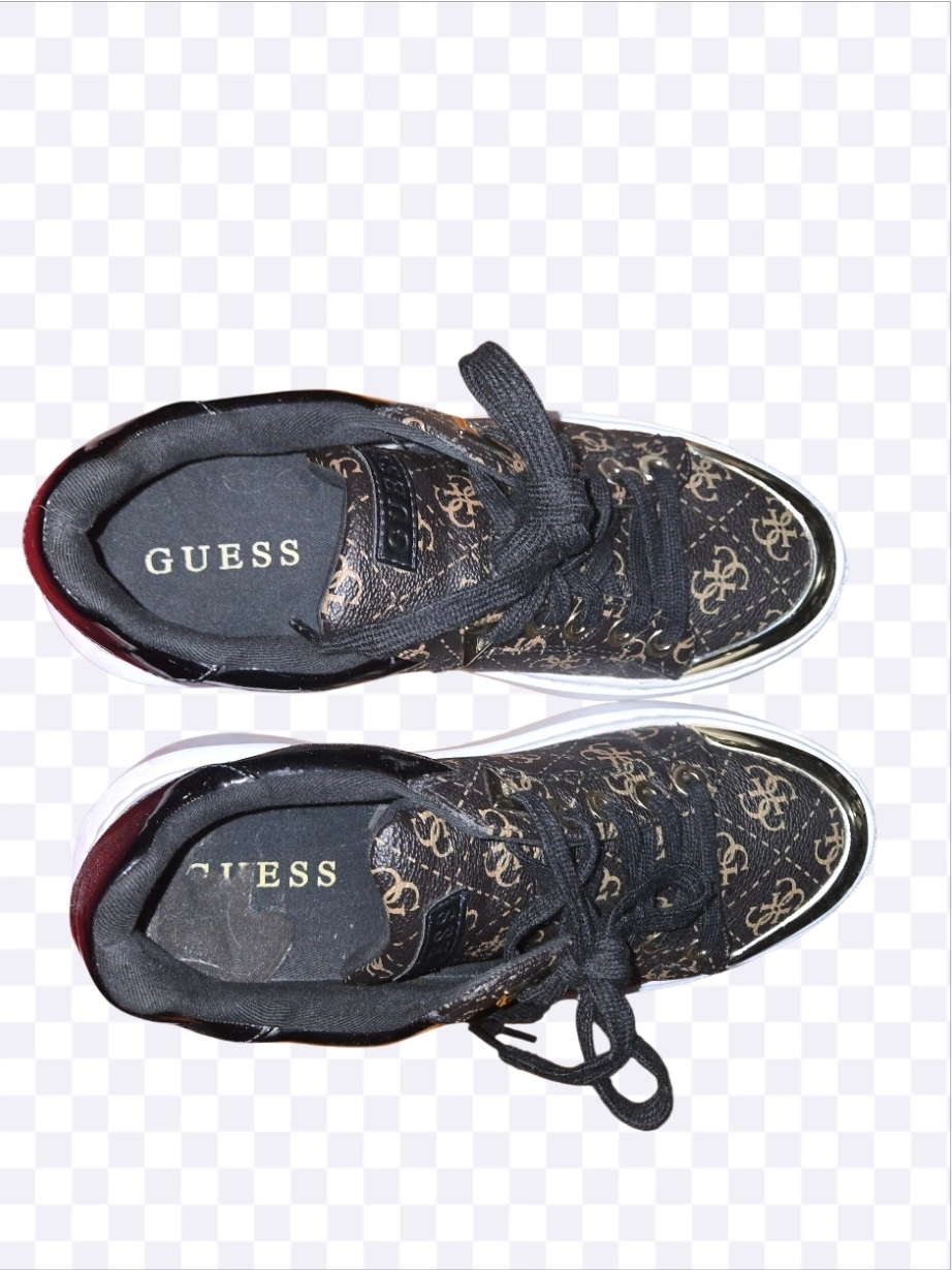 Stylish Guess sneakers with a brown and gold pattern! These are in good condition and ready for a new home. They feature black laces and a white sole.