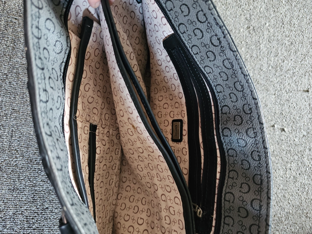 Selling a Guess tote bag in grey. It's in great condition and has a stylish design with the Guess logo pattern. Perfect for everyday use!