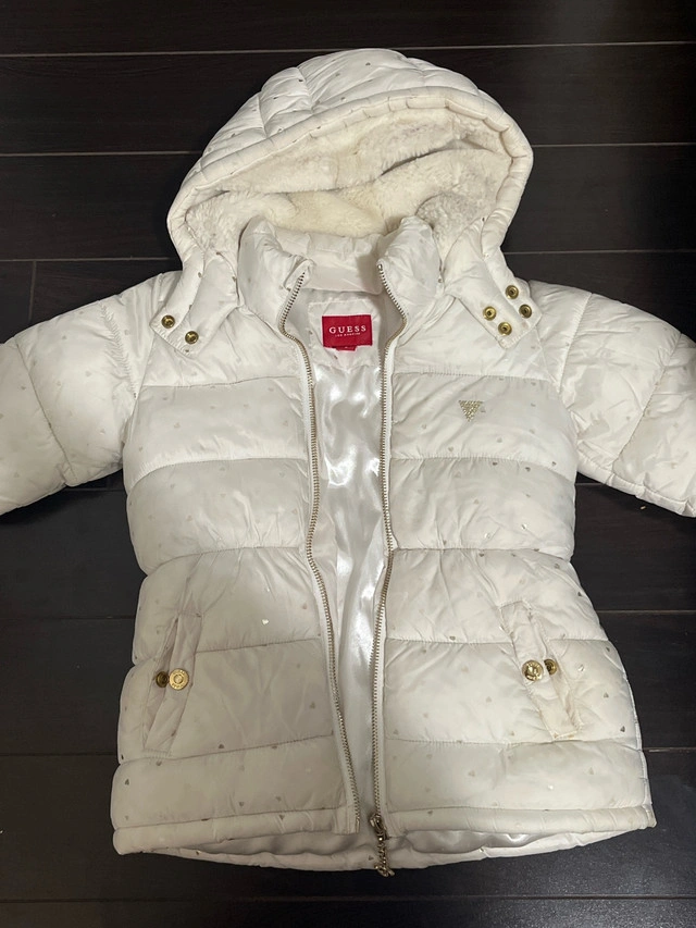 This is a Guess white jacket, perfect for keeping your little one warm and stylish during the colder months! It's a puffy style with a hood and has a cute design with little hearts all over. The jacket is in used condition, with some wear visible, adding a bit of character. Specifications: * Brand: Guess * Colour: White * Style: Puffer Jacket * Features: Hooded Size 5 T