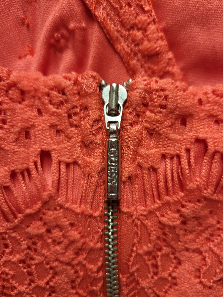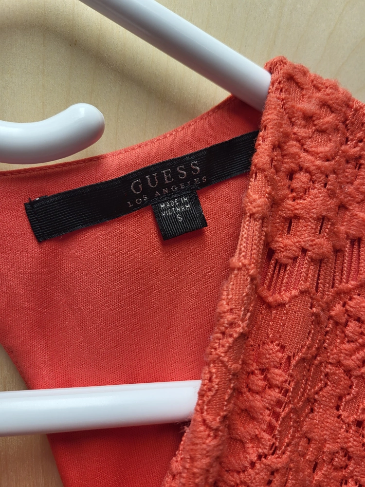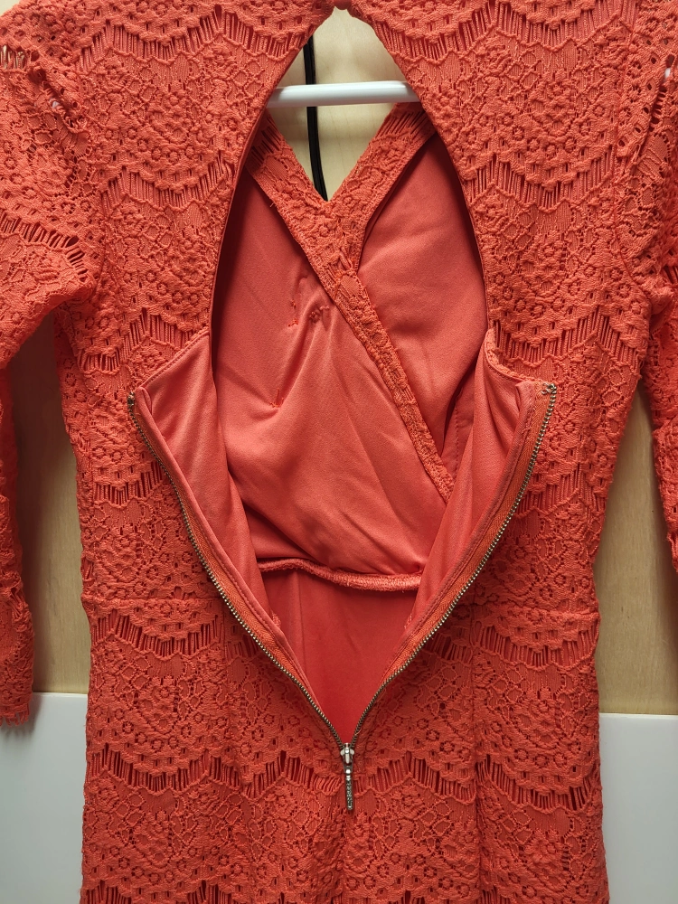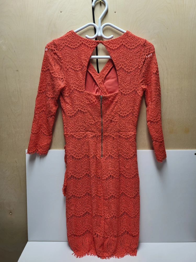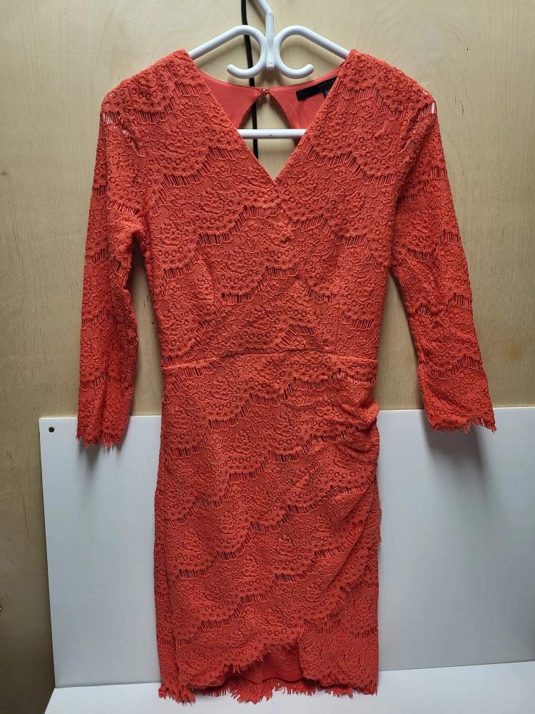 This striking lace coral wrap over dress by Guess is perfect for a cocktail night out. It features a flattering v-neckline and 3/4 sleeves, offering a chic and sophisticated look. The dress is designed with asymmetrical ruching to accentuate your silhouette, making it a standout choice for any special occasion! 100% Nylon