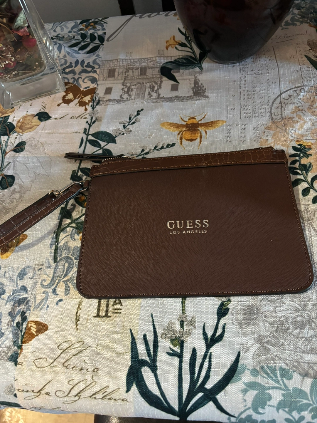 Brown Guess wristlet with a zipper closure and a wrist strap. 9 inches.