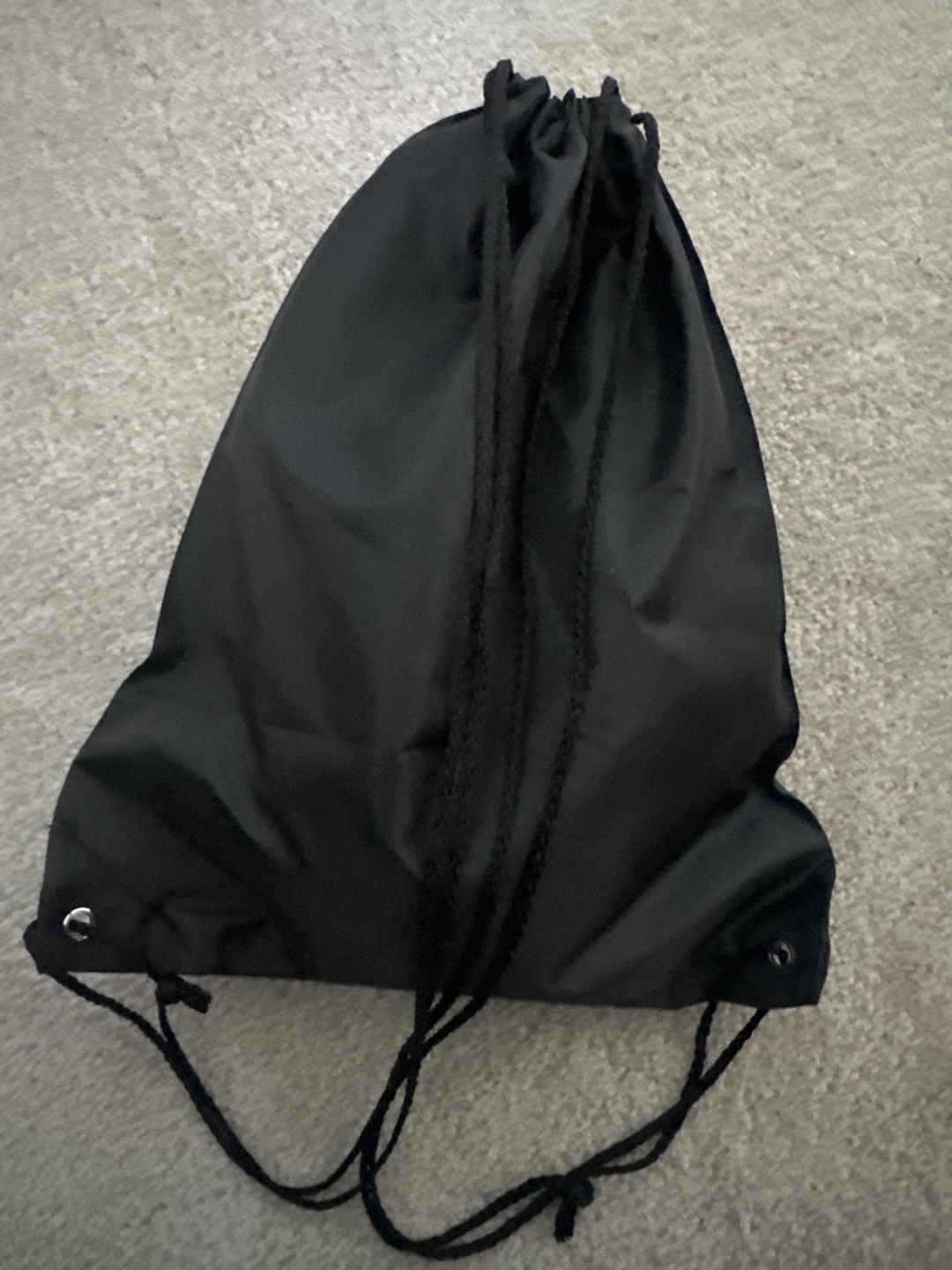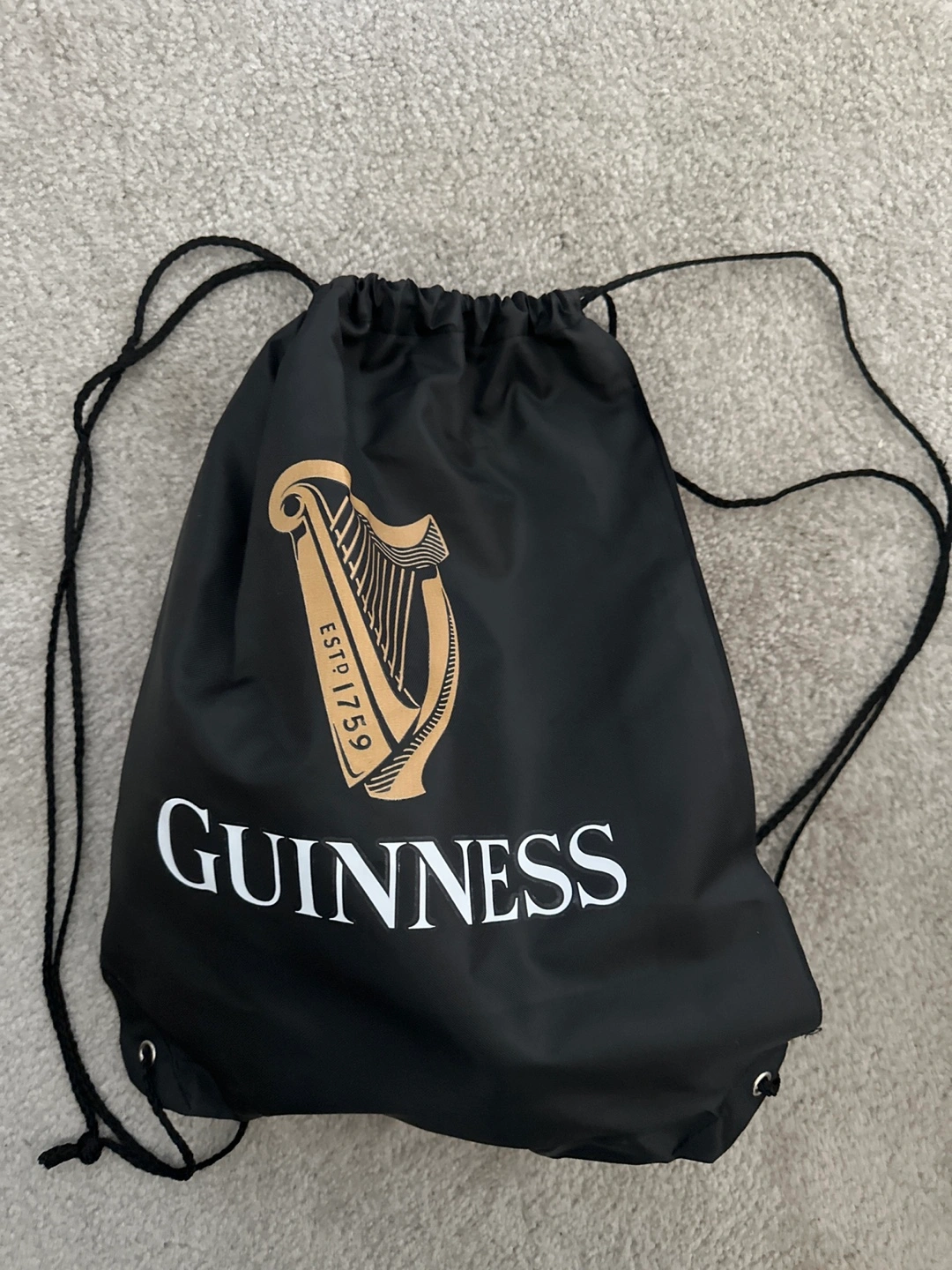 Black drawstring bag. Features the Guinness harp logo and 'Est 1759'. Great for travel or the gym.