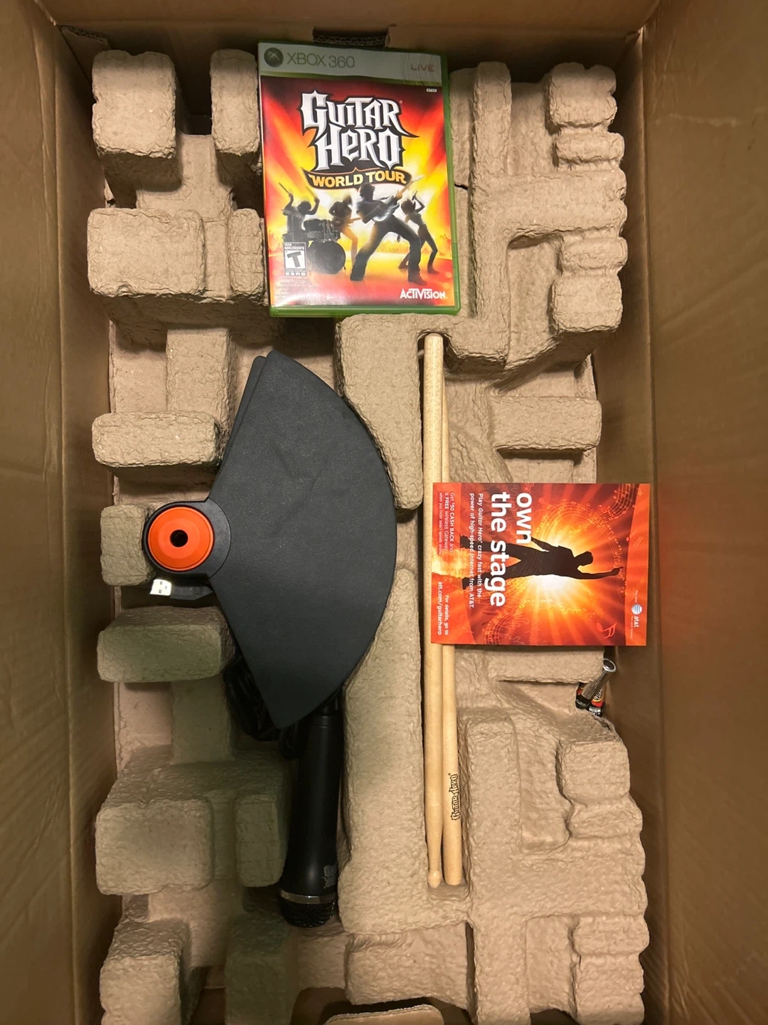 Selling a Guitar Hero World Tour band in a box, complete with drums, guitar, microphone, and game for Xbox 360! Own the stage and rock out with your friends. Everything is included and ready to play!