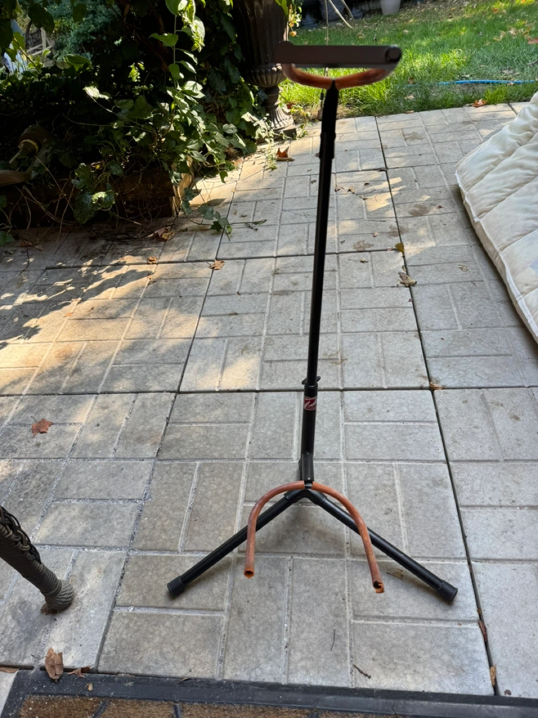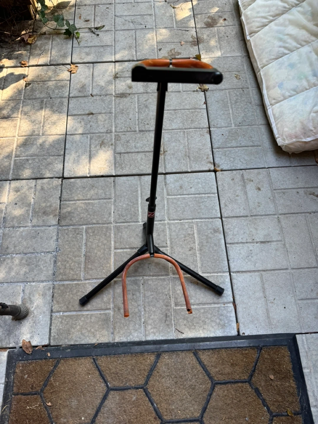 Selling a guitar stand in good condition. It's black with orange accents and features a sturdy tripod base for stability. Perfect for holding your guitar securely at home or on stage