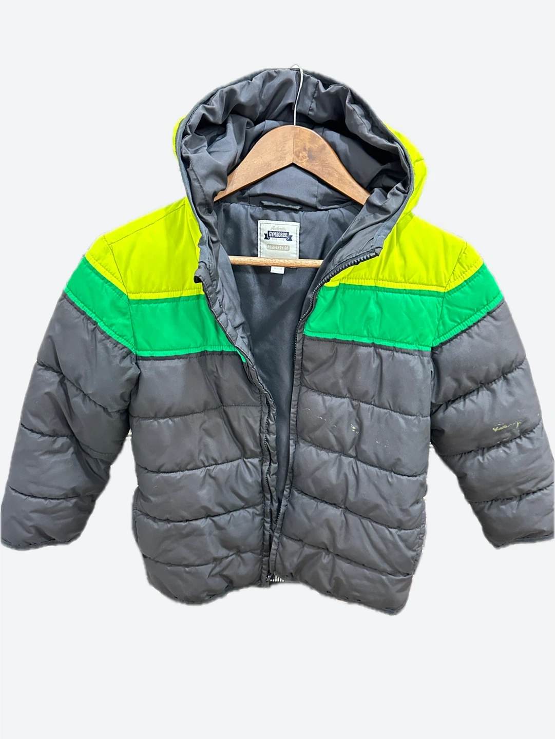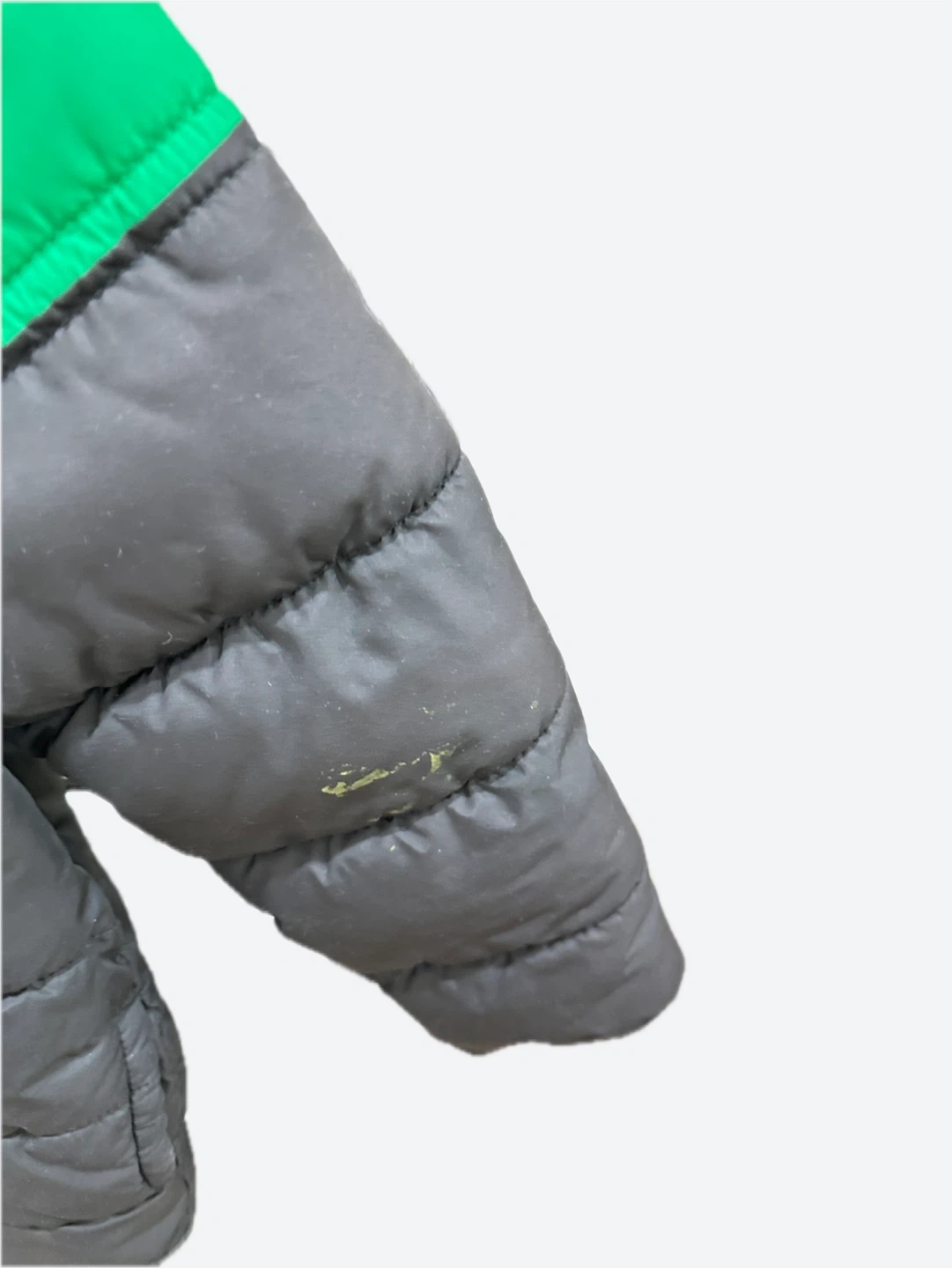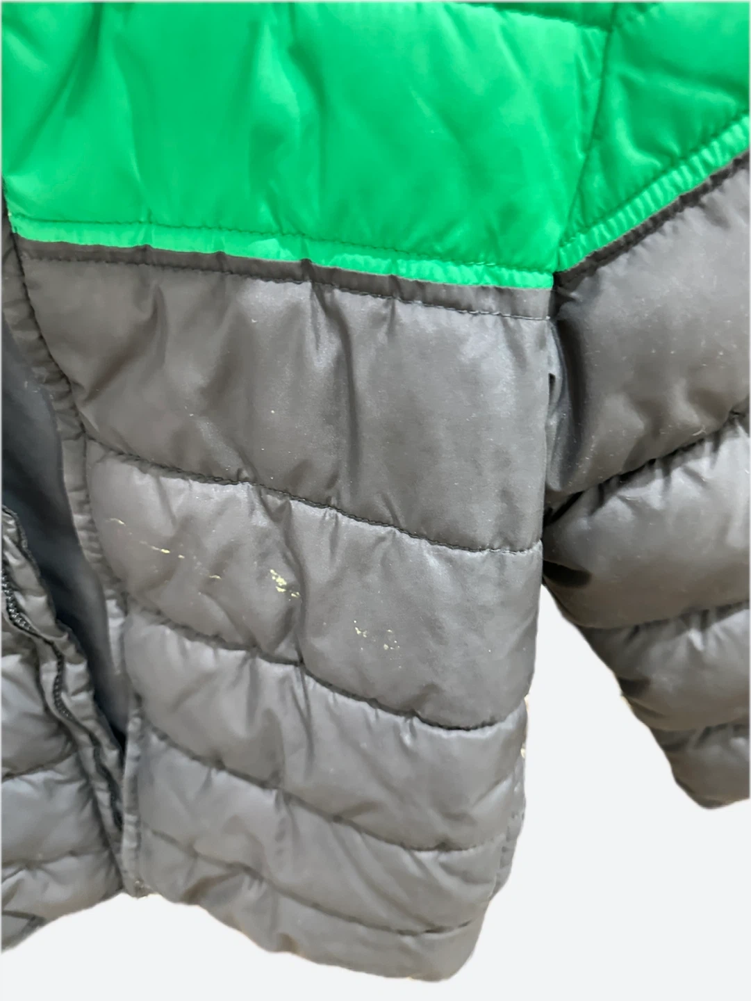 A warm and stylish puffer jacket for kids, perfect for the colder months! It's a size 6 and features a cool grey and green colour block design. There are some signs of wear, as shown in the photos, but it's still got lots of life left