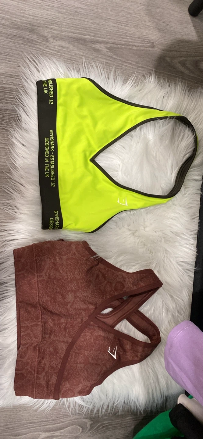 Selling a couple of Gymshark sports bras in size small. One is reversible colour and the other is a brown snakeskin pattern. Both are in great condition and ready for a new home! They are just too small for me. 25$ each or 45$ both