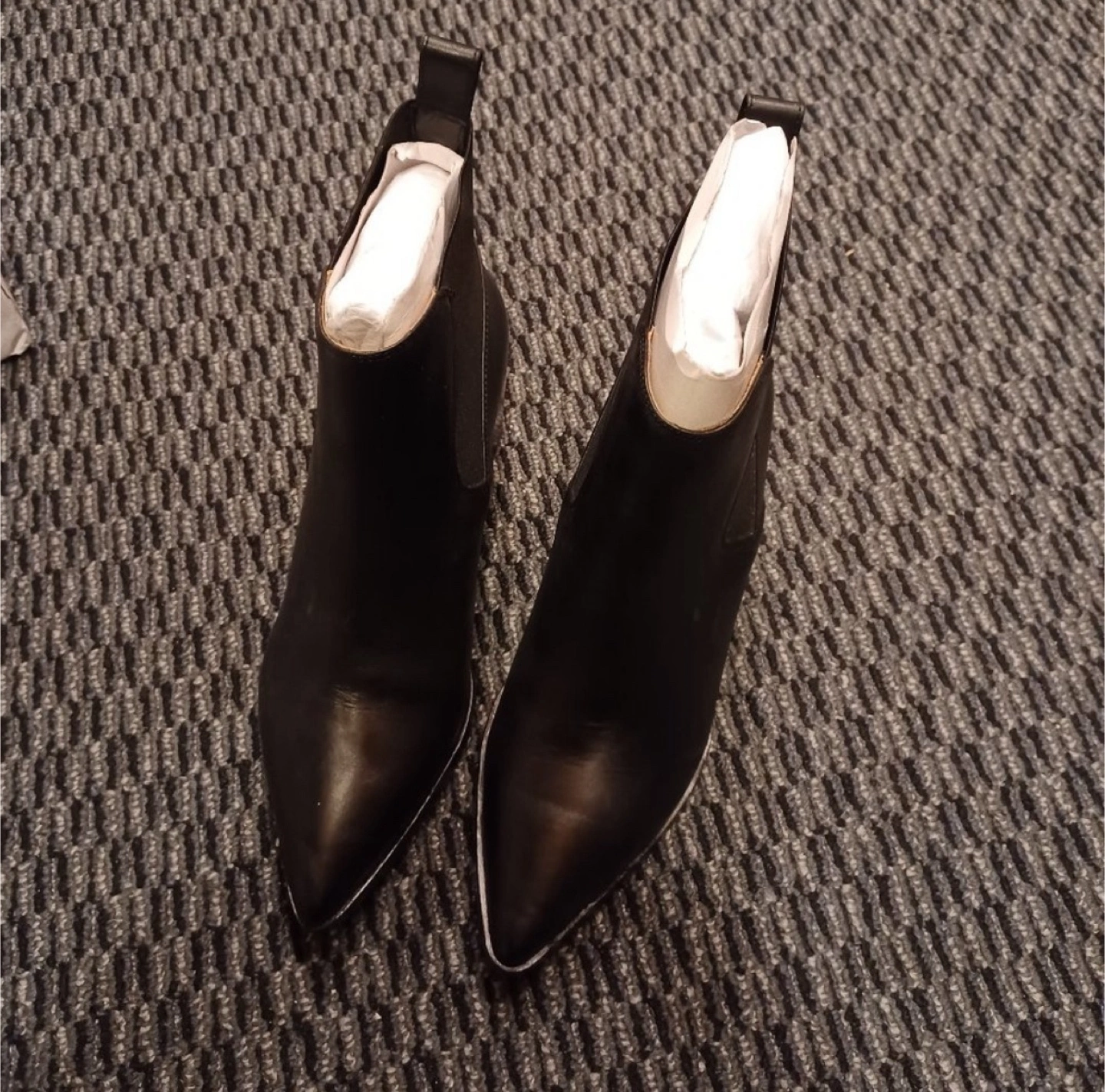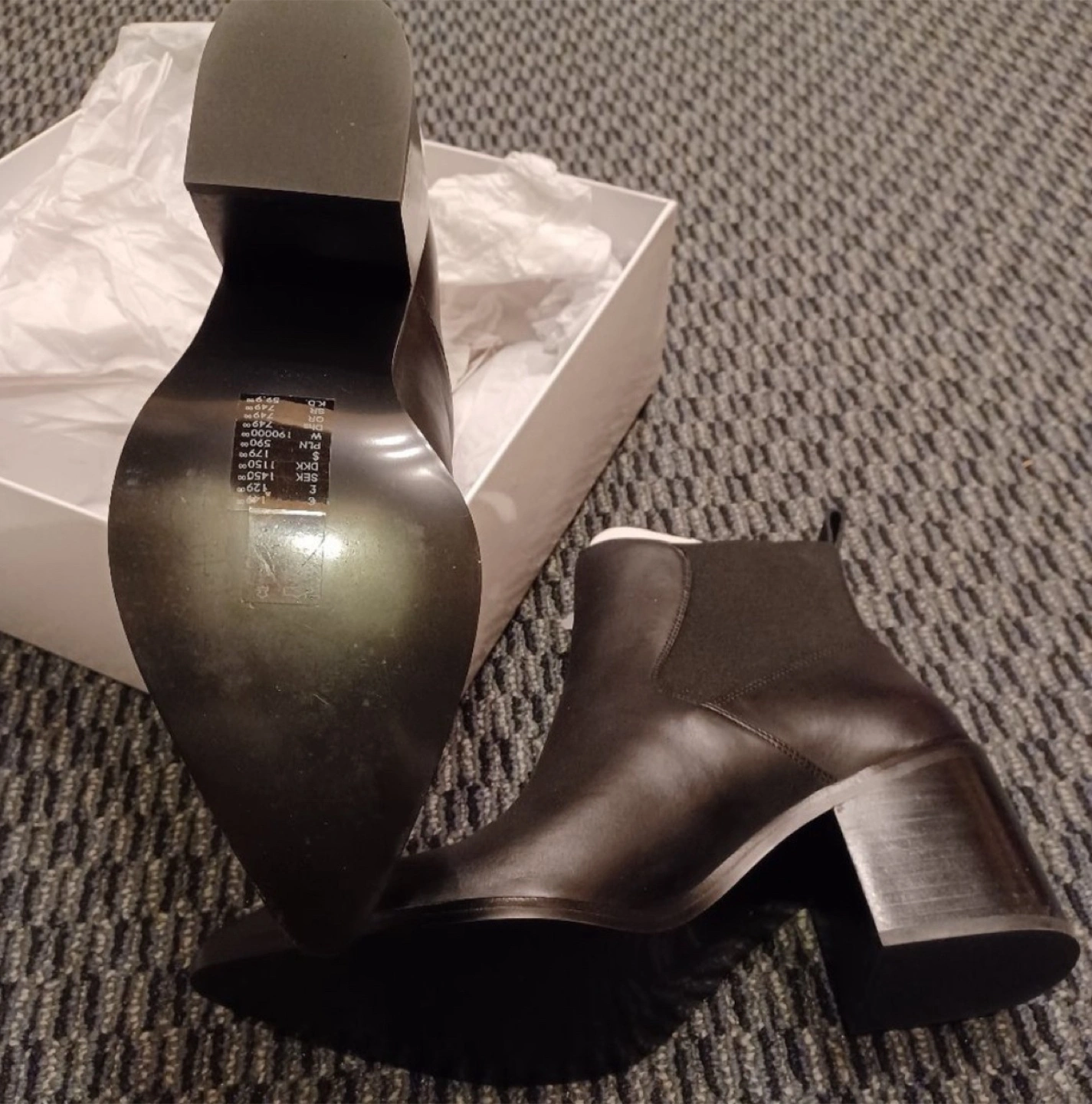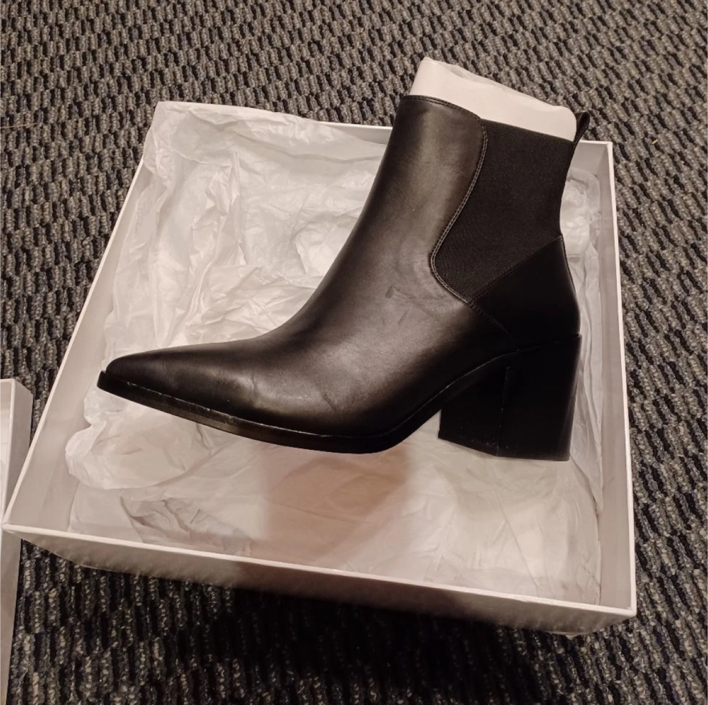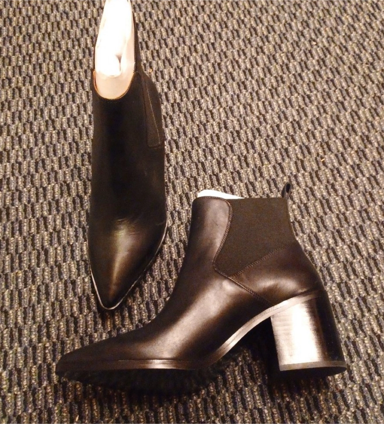 Selling a pair of H&M heeled ankle boots in black leather. They are a size 11.5, never worn, and come with the original box. Perfect for dressing up or down!