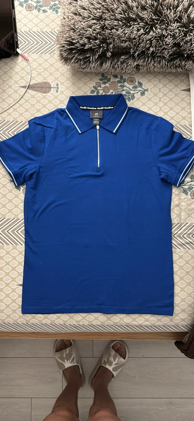 This is a blue polo shirt from H&M with a zipper and white accents on the collar and sleeves