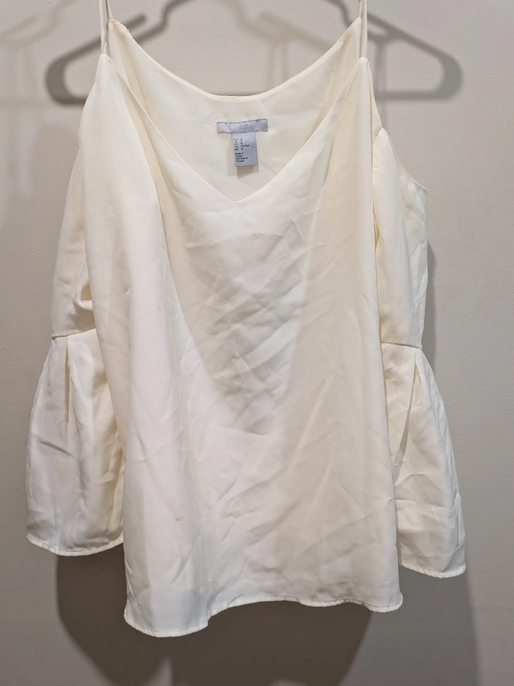 Selling a cream-coloured blouse from H&M in size 10. It has a V-neck and flowy sleeves. There are some small spots on the front, as shown in the pictures.