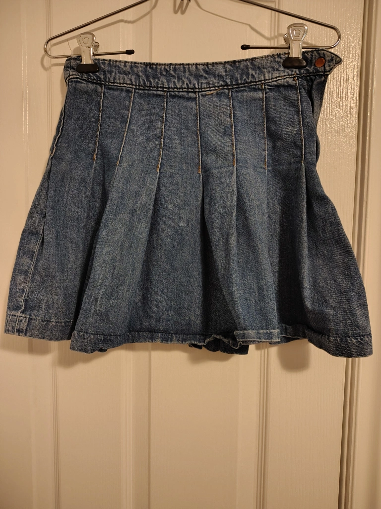 Cute H&M Divided pleated denim mini skirt in a size 2. It's in great condition and ready for a new home! perfect for a cowgirl costume or for the next country concert! sturdy zipper and an overall cute addition