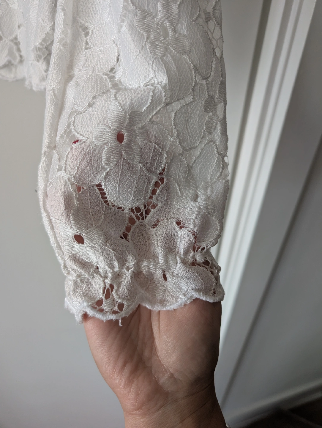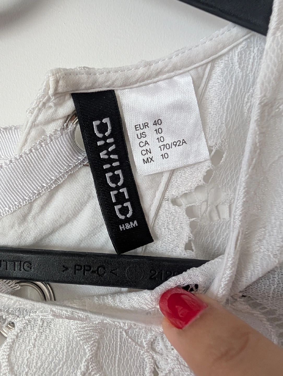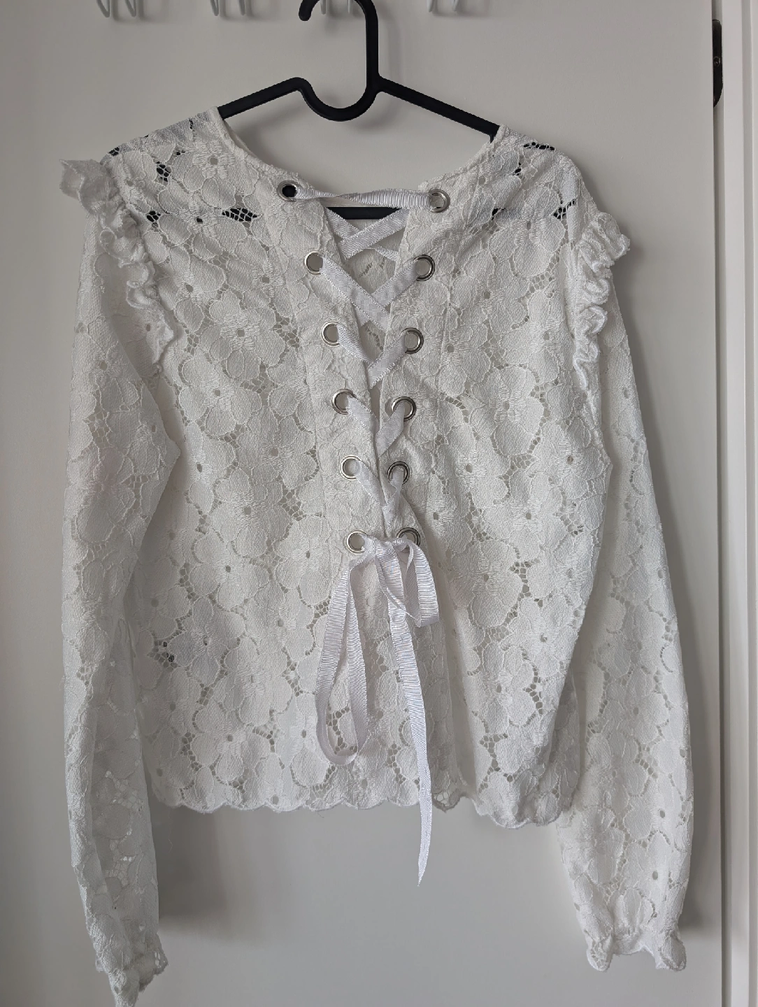 Selling a cute H&M Divided blouse! It's a size 10 and features a delicate white lace pattern. The blouse has long sleeves and a unique lace-up design in the back. Perfect for dressing up or down! Selling because it's no longer my style.