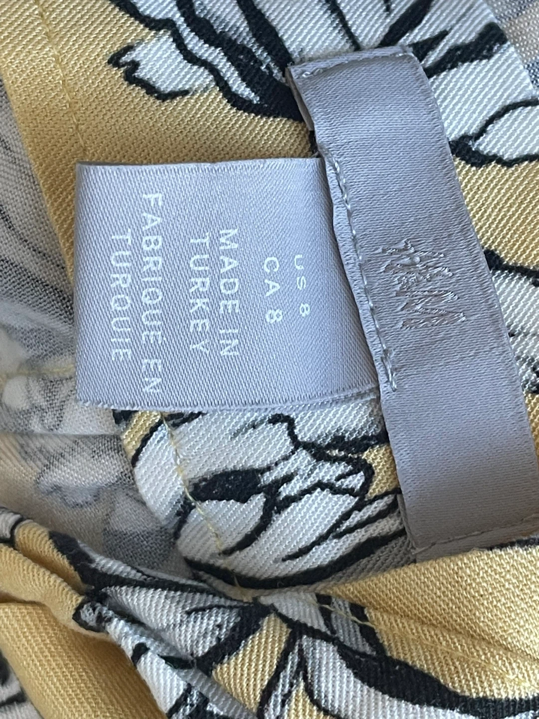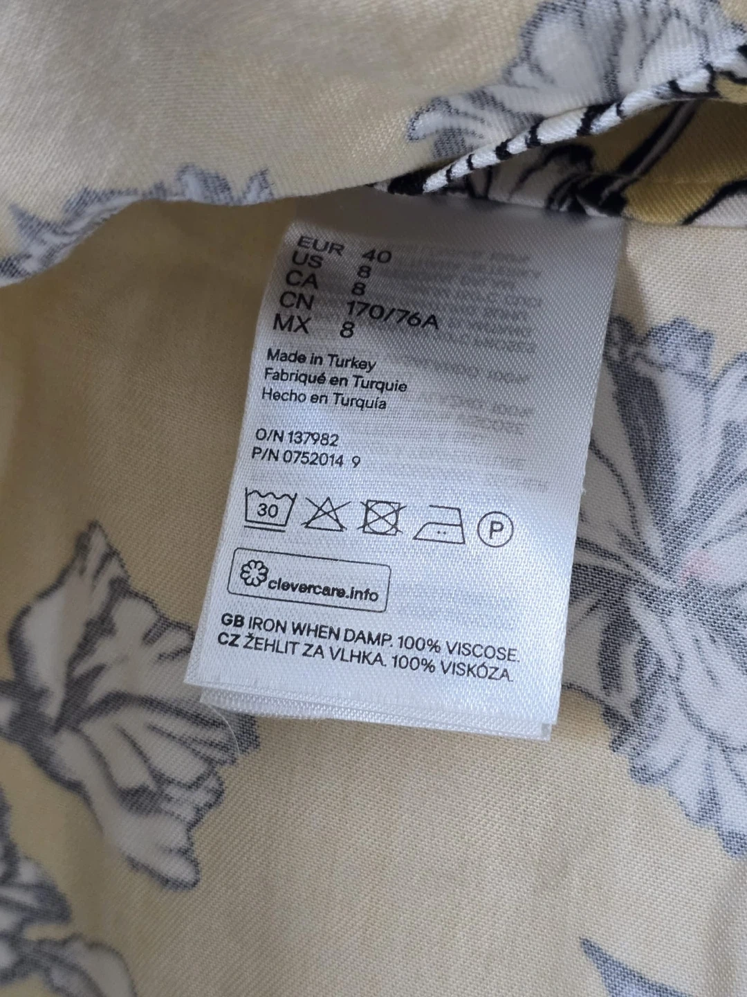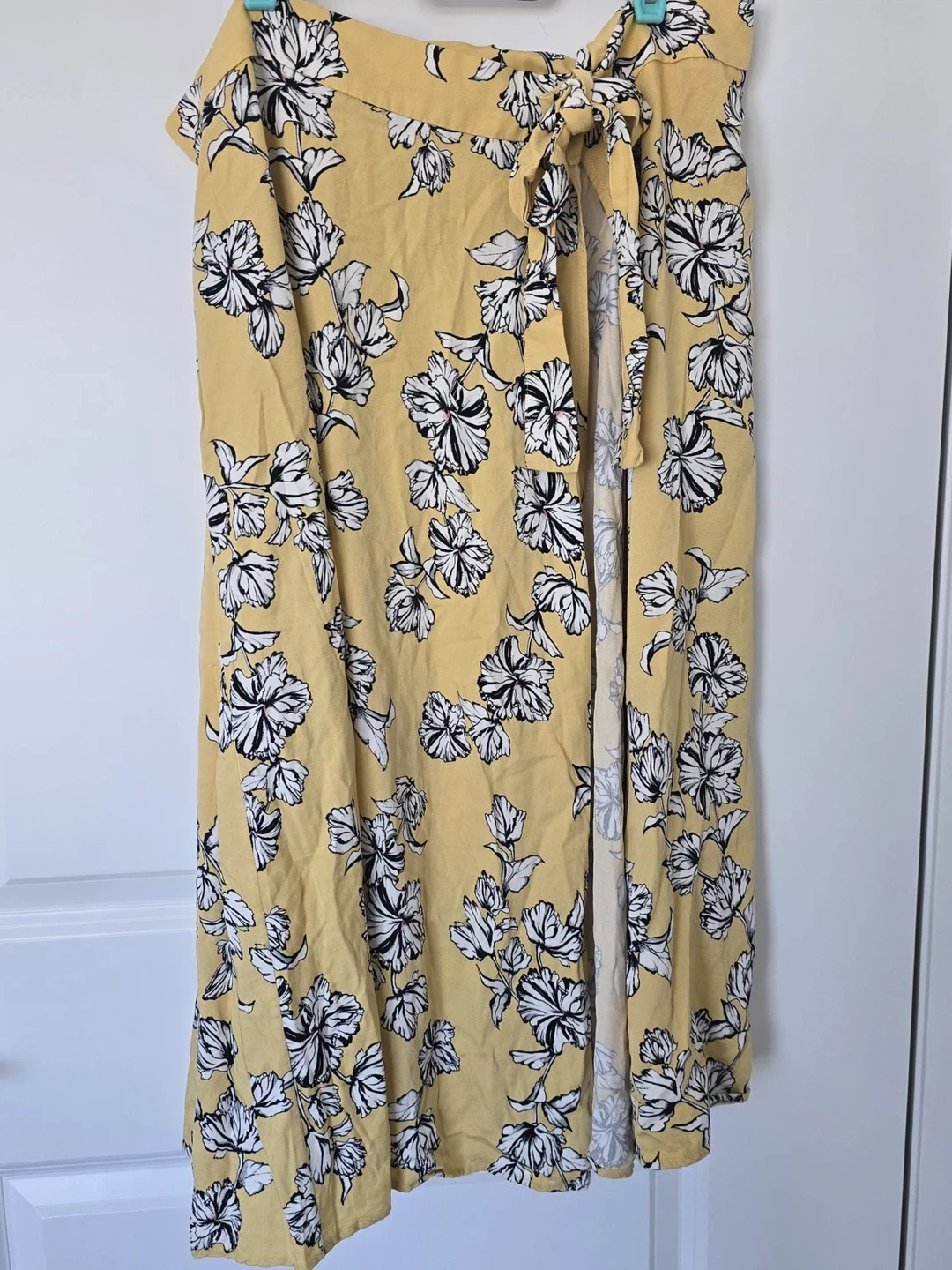 Selling a cute H&M wrap skirt in size 8! It has a lovely floral pattern on a yellow background. The material is 100% viscose, making it lightweight and comfy for summer days