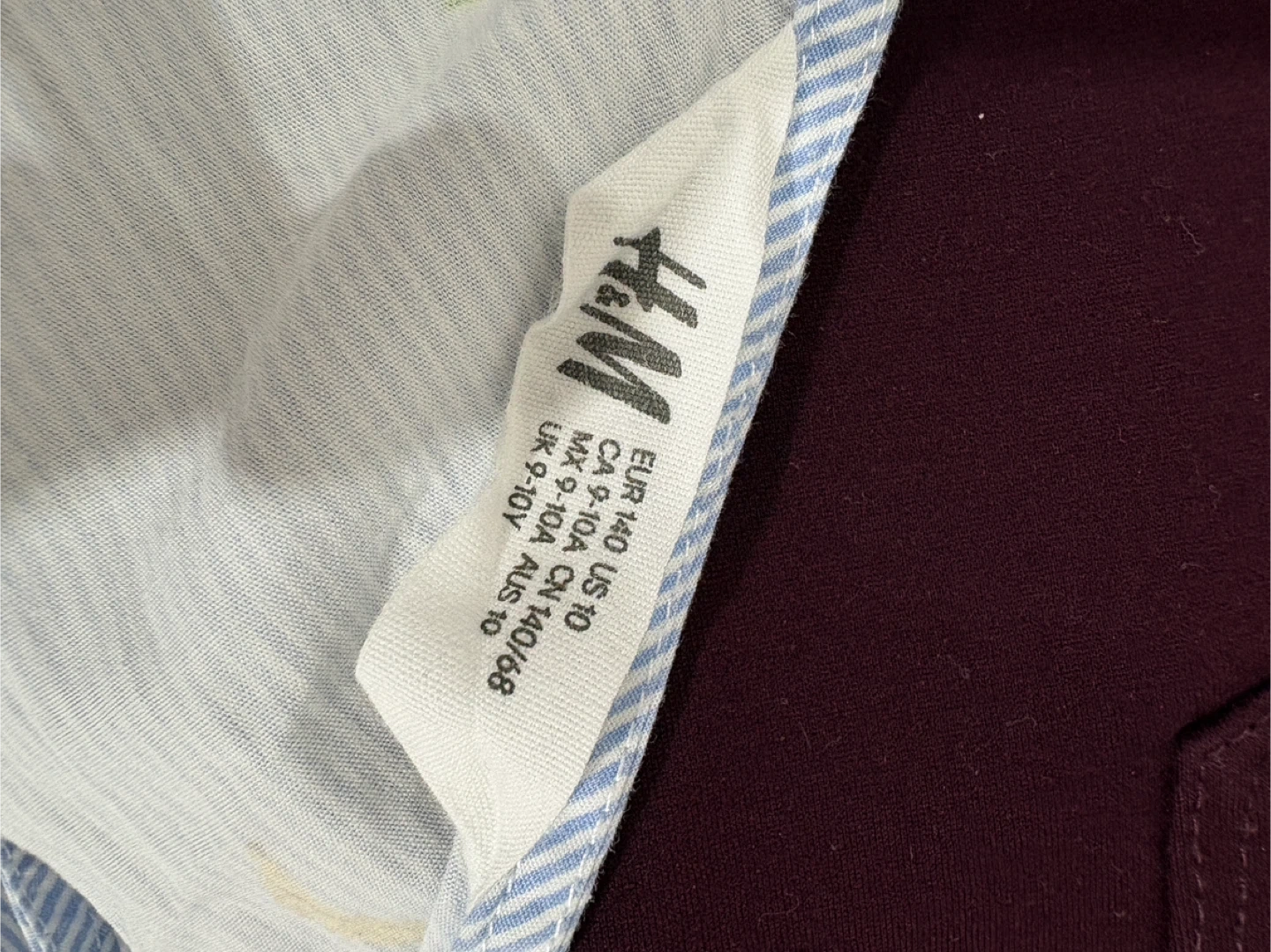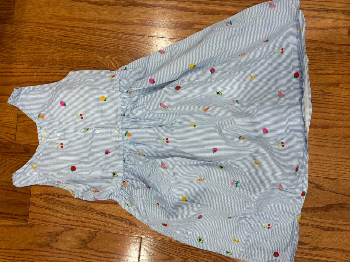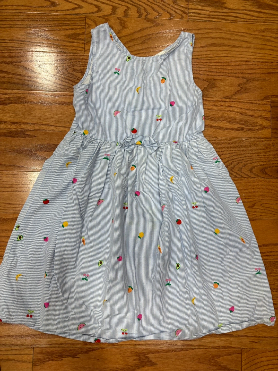 H&M dress for girls, size 9-10Y. Light blue and white striped pattern with colourful fruit designs.