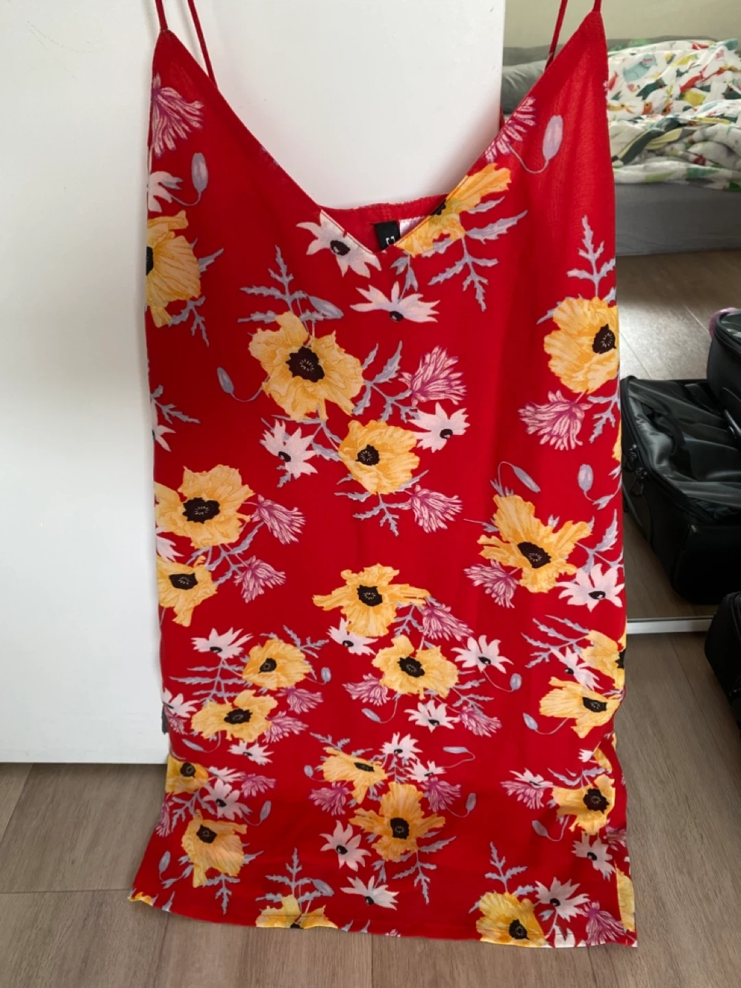 Selling a vibrant red dress from H&M! It features a lovely floral pattern with yellow and white flowers. Perfect for adding a pop of colour to your wardrobe