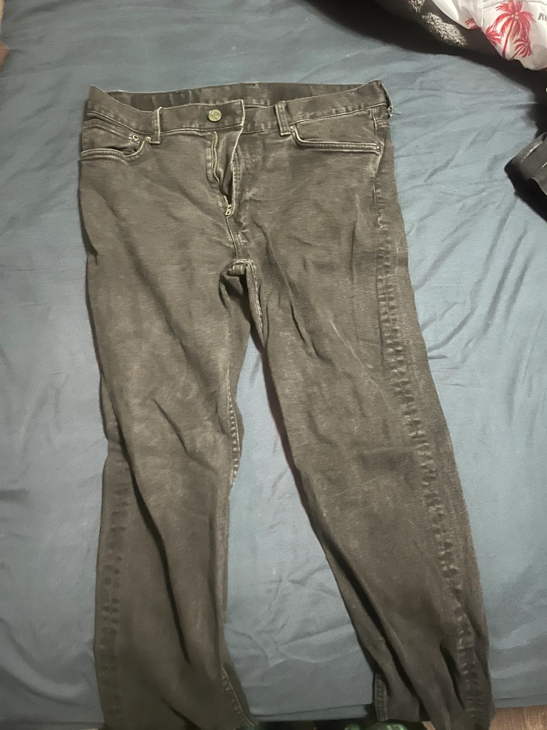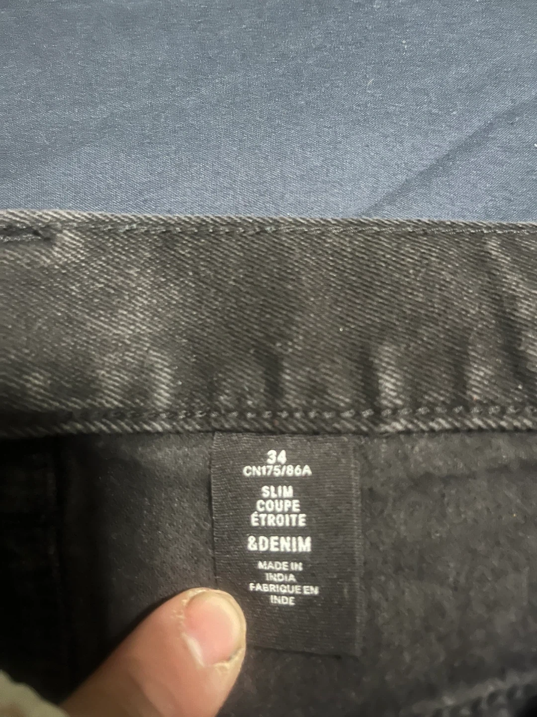 Selling a pair of H&M slim-fit denim jeans in black. They are size 34 and in good condition. Perfect for everyday wear! $15