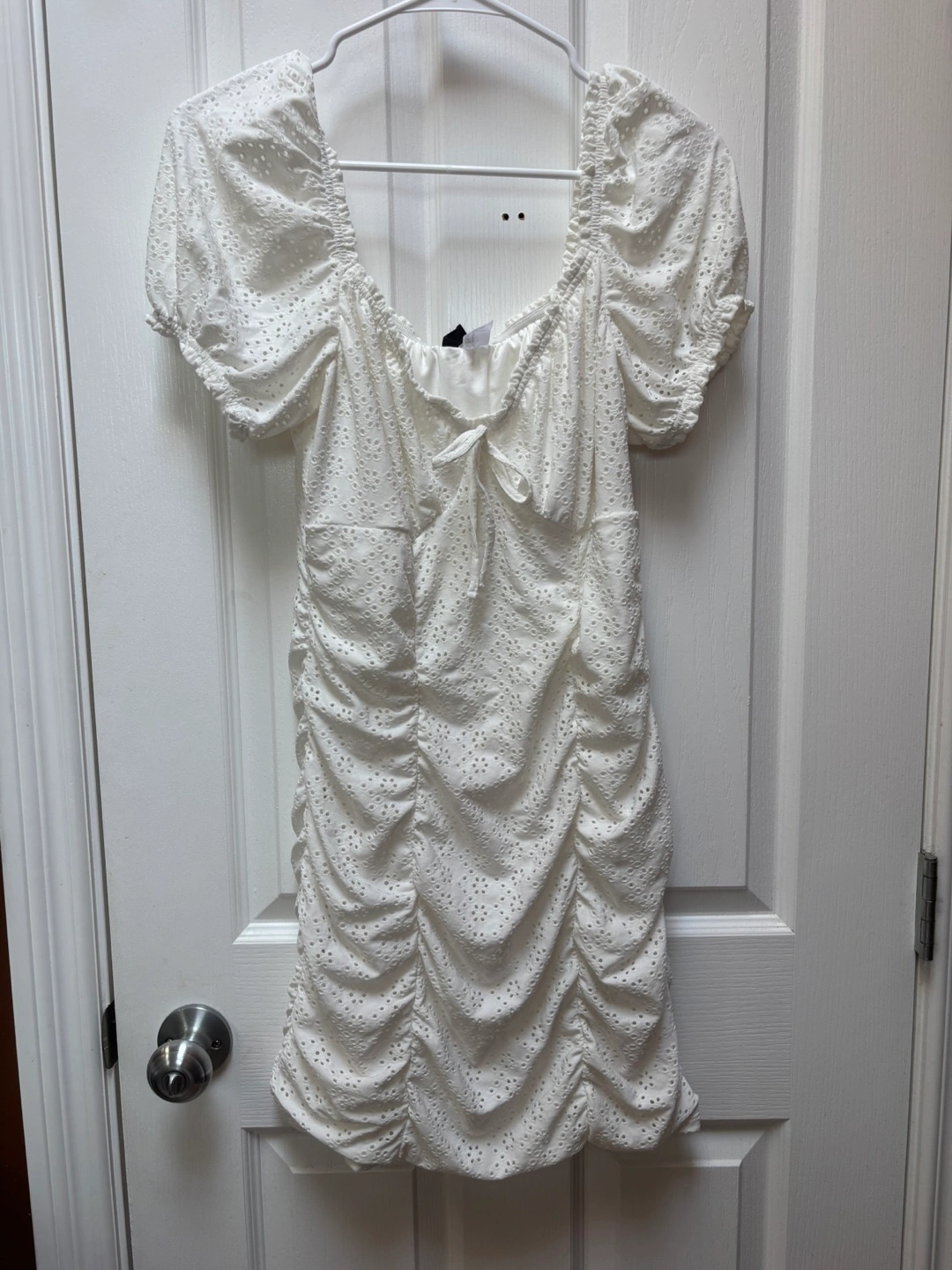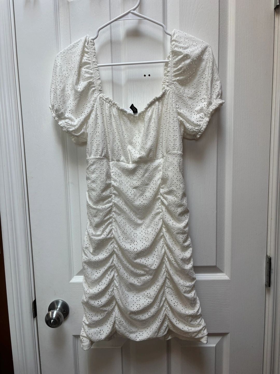 Selling a cute white ruched mini dress from H&M! It has a square neckline and short puff sleeves. Perfect for summer! Only wore once for my graduation.